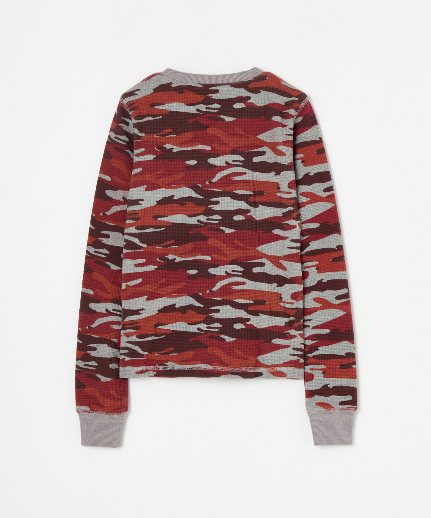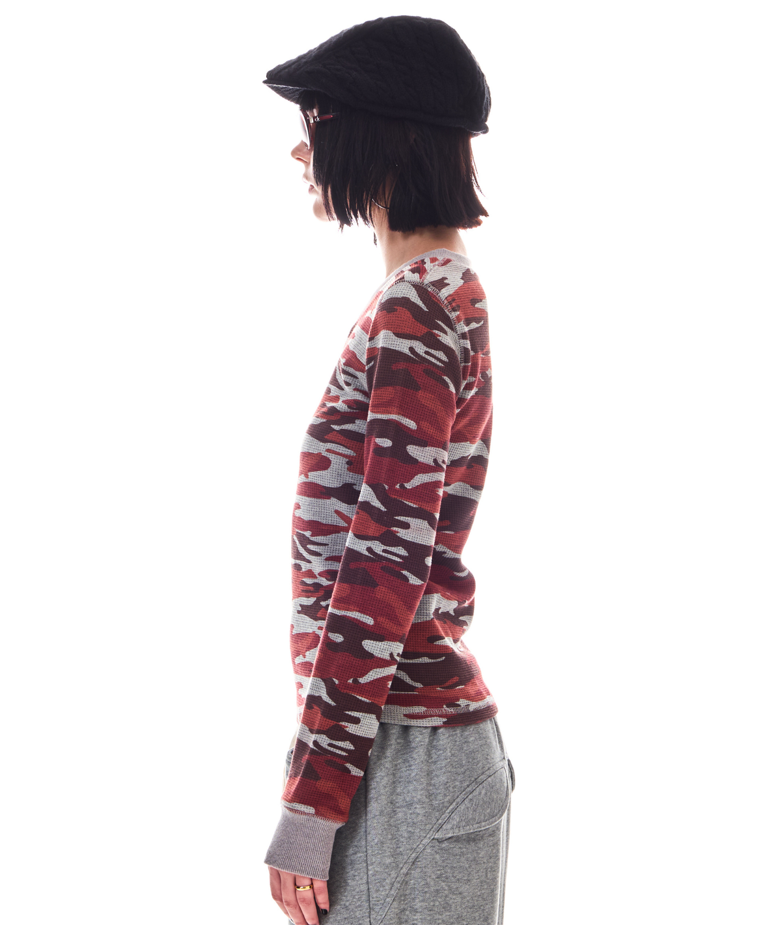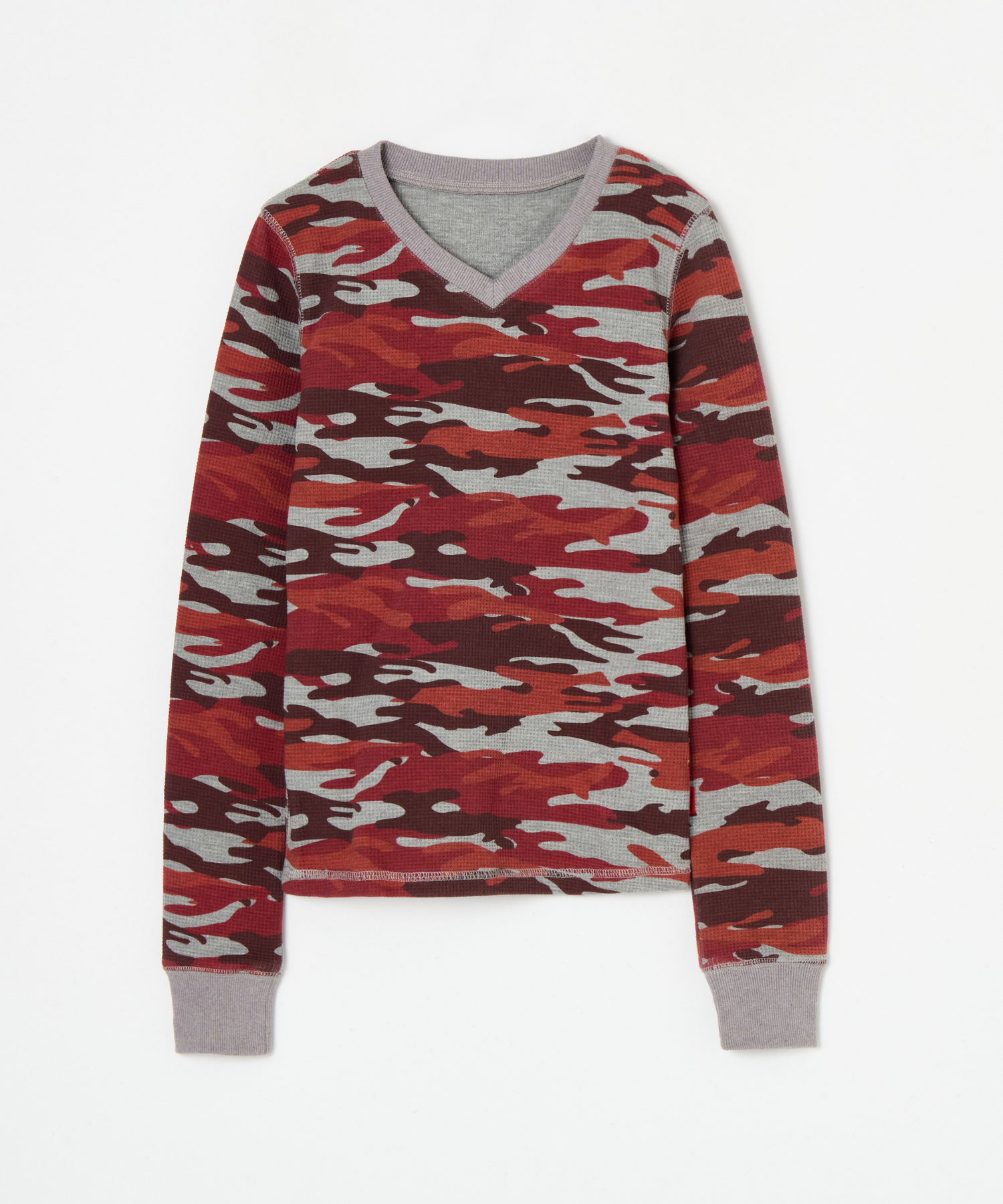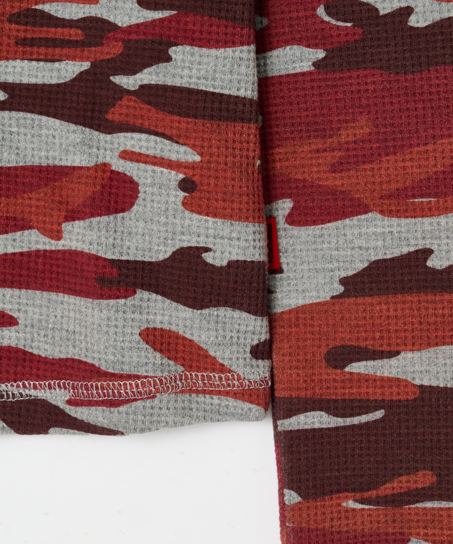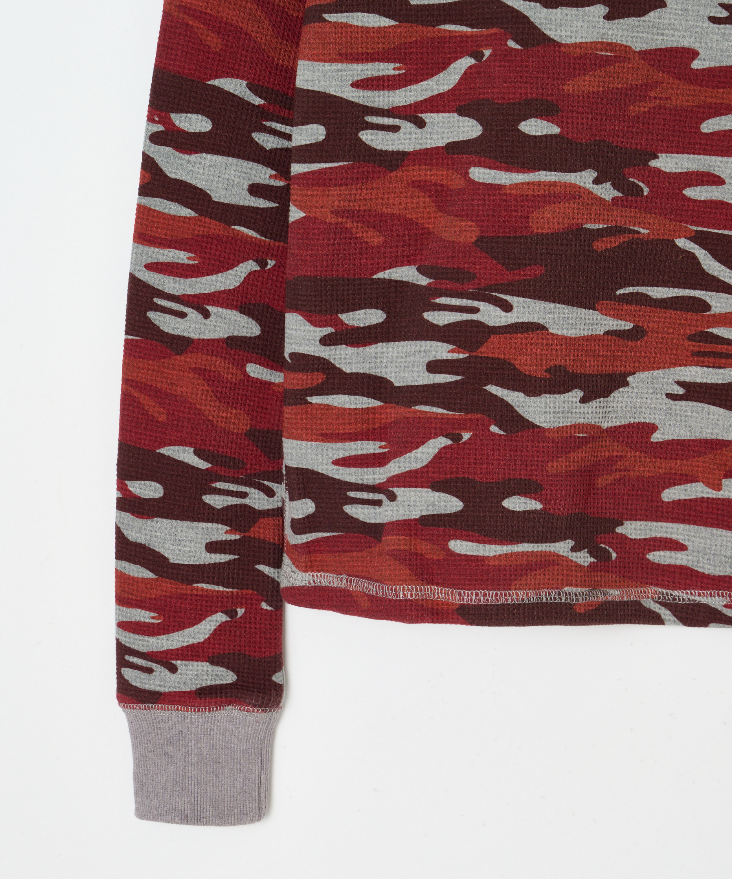 メンズライクなオンスのワッフル生地にオリジナル配色のカモ柄をプリントしたジャストフィットトップス。