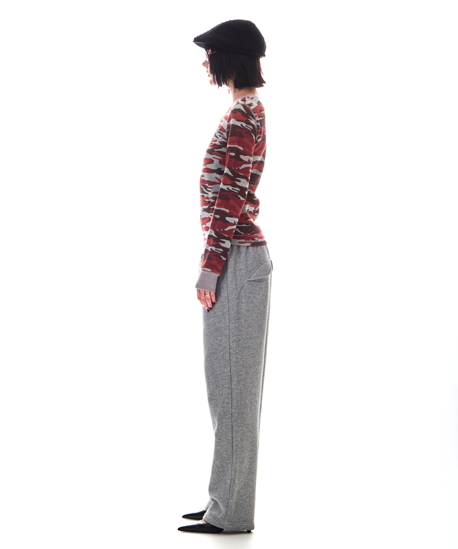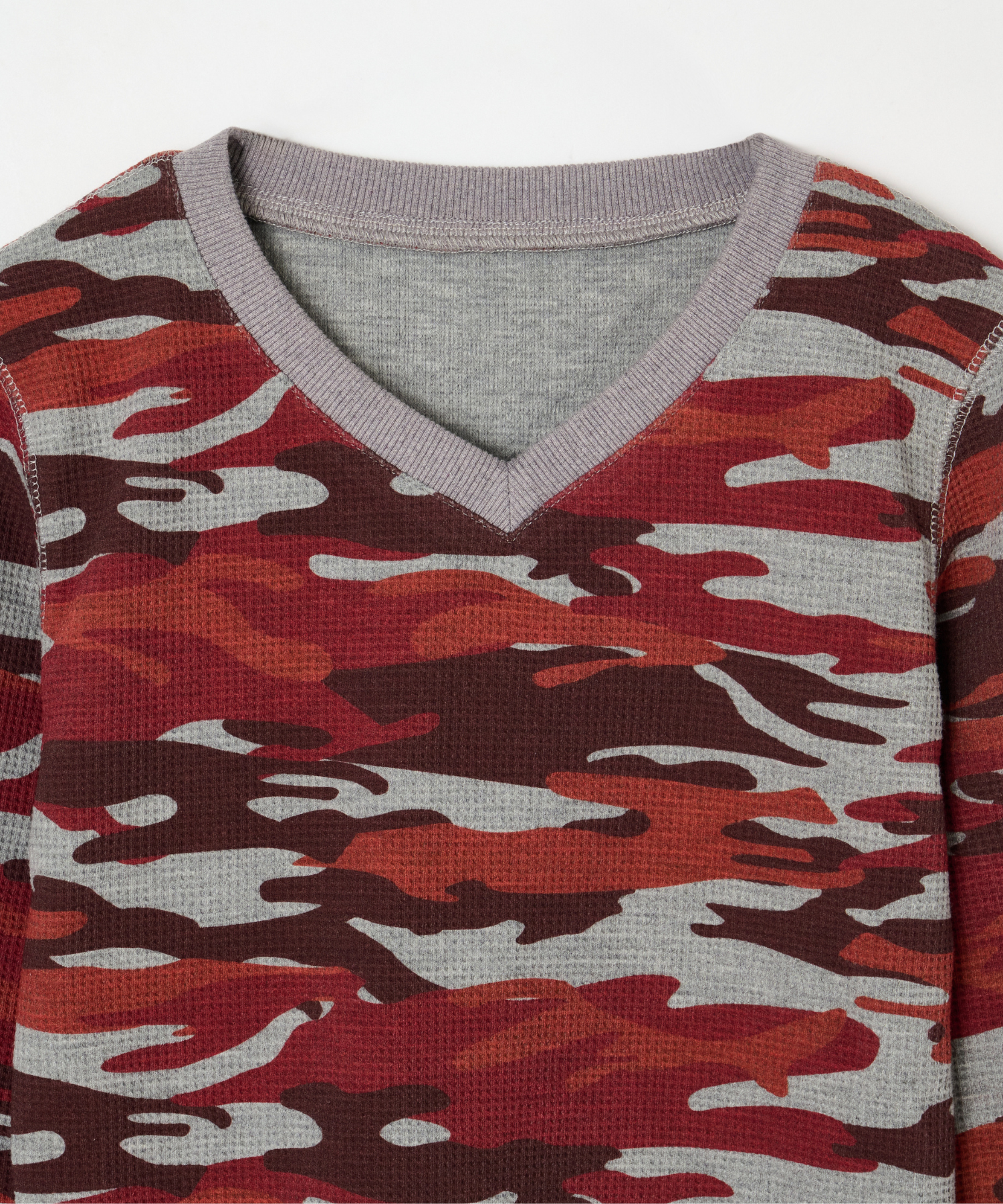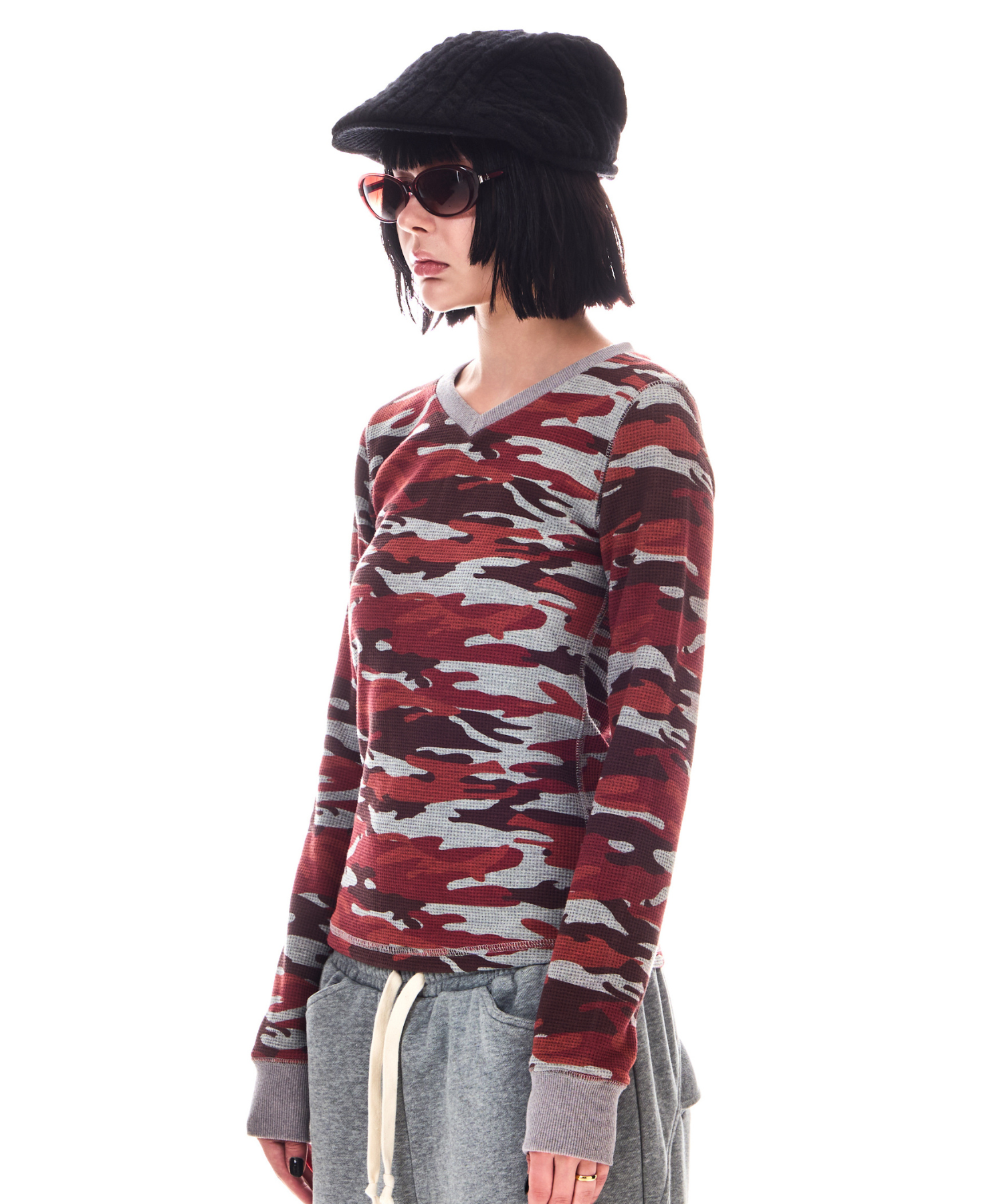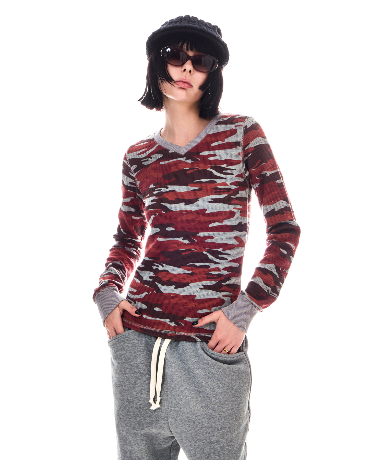 メンズライクなオンスのワッフル生地にオリジナル配色のカモ柄をプリントしたジャストフィットトップス。