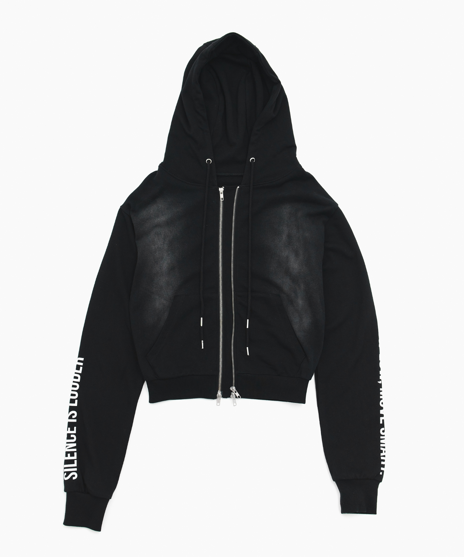 スプレー加工のややコンパクトのジップアップフーディー。