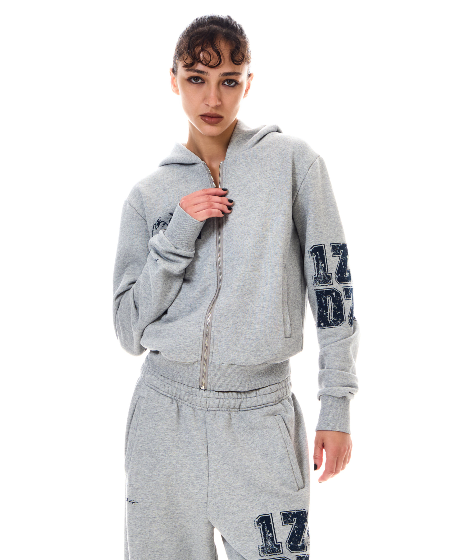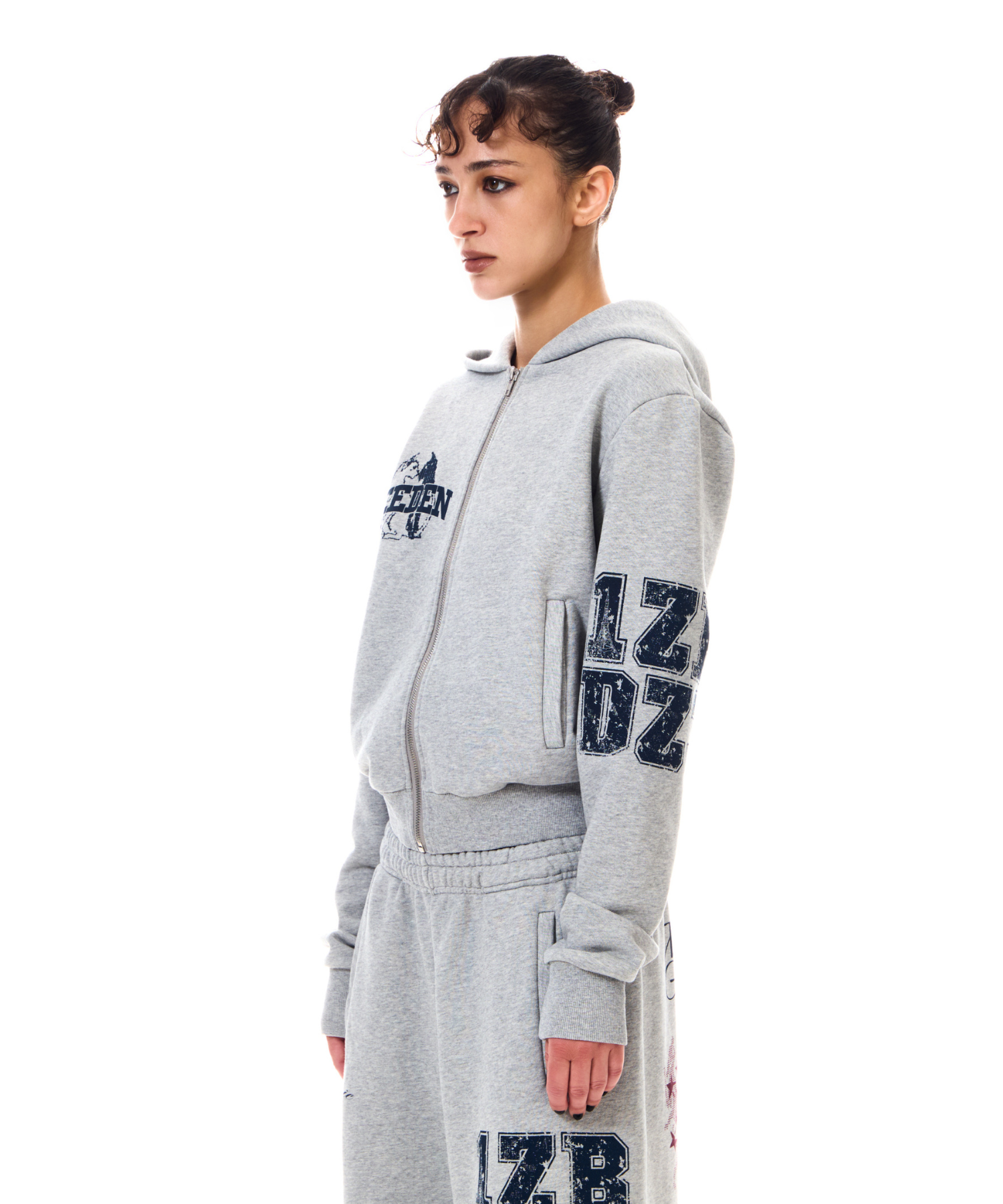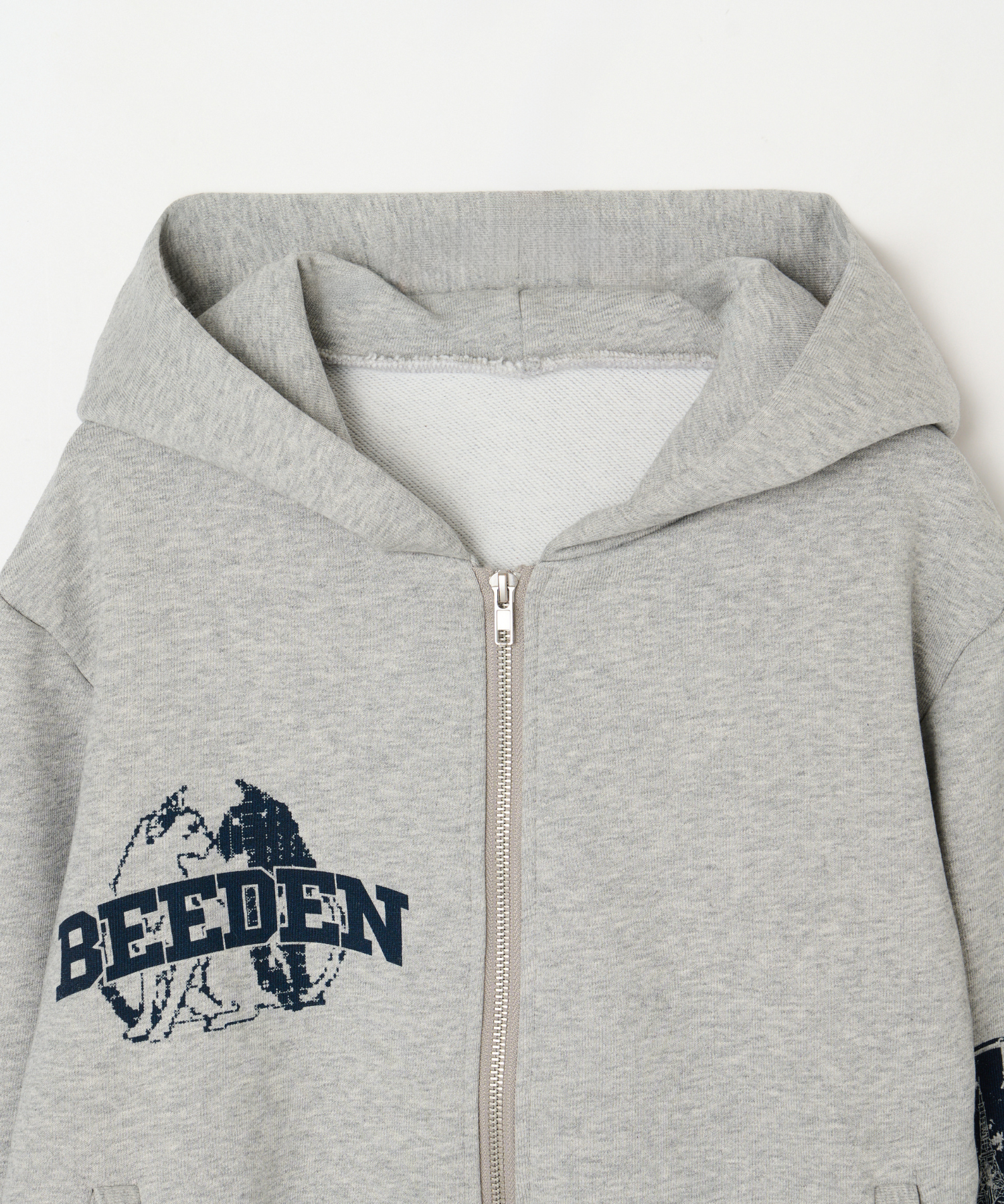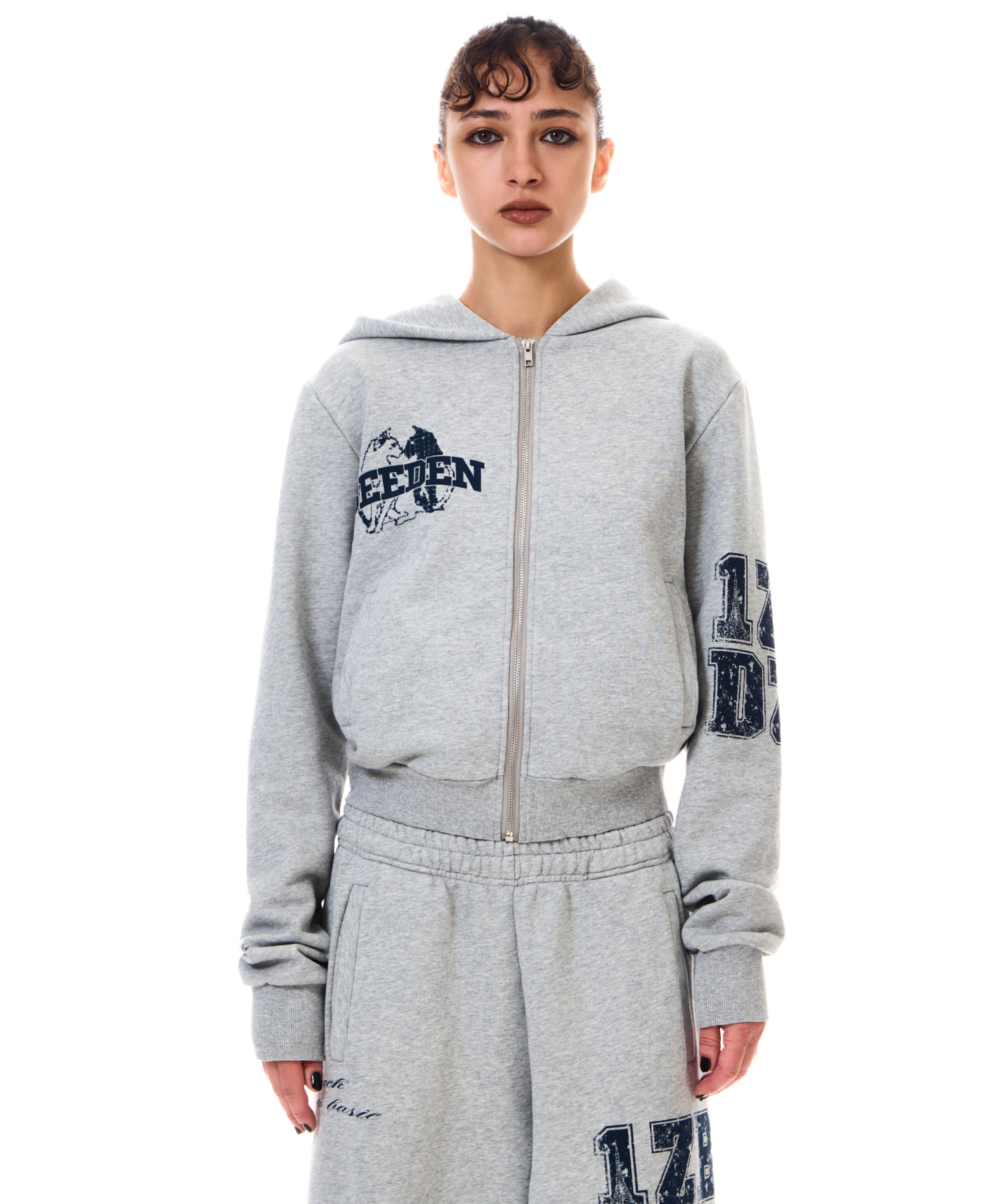 ランダムに配置されたオリジナルグラフィックプリントが斬新なジップアップトップス。