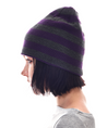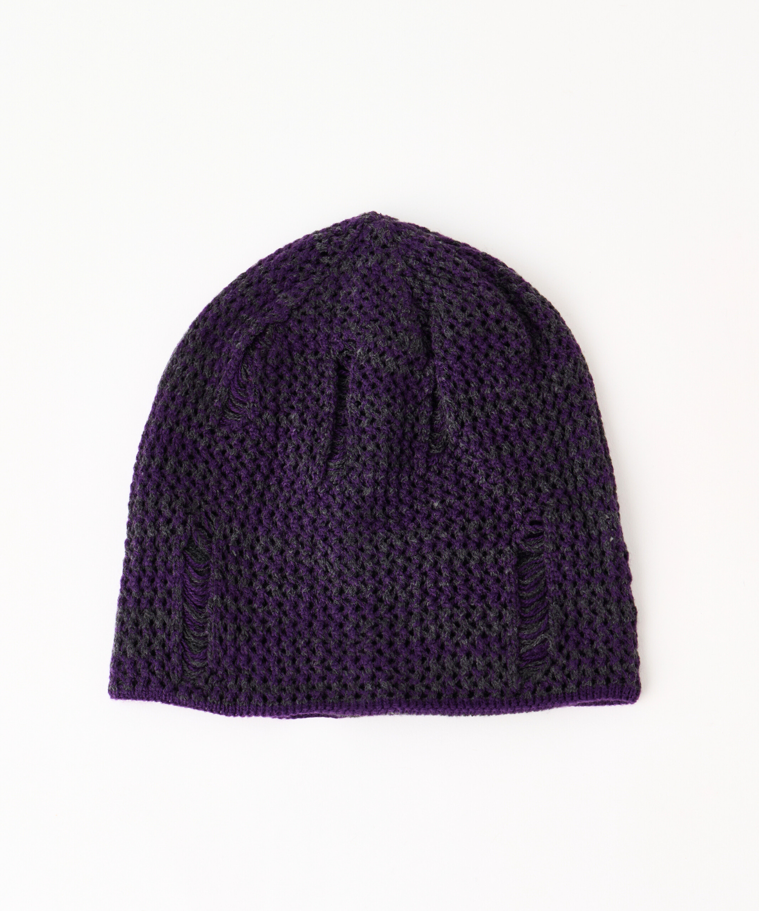片面はスタイリングに変化をもたらしてくれるボーダー、もう片面は透かし編みが新鮮で他にはない雰囲気のツートーンビーニーです。