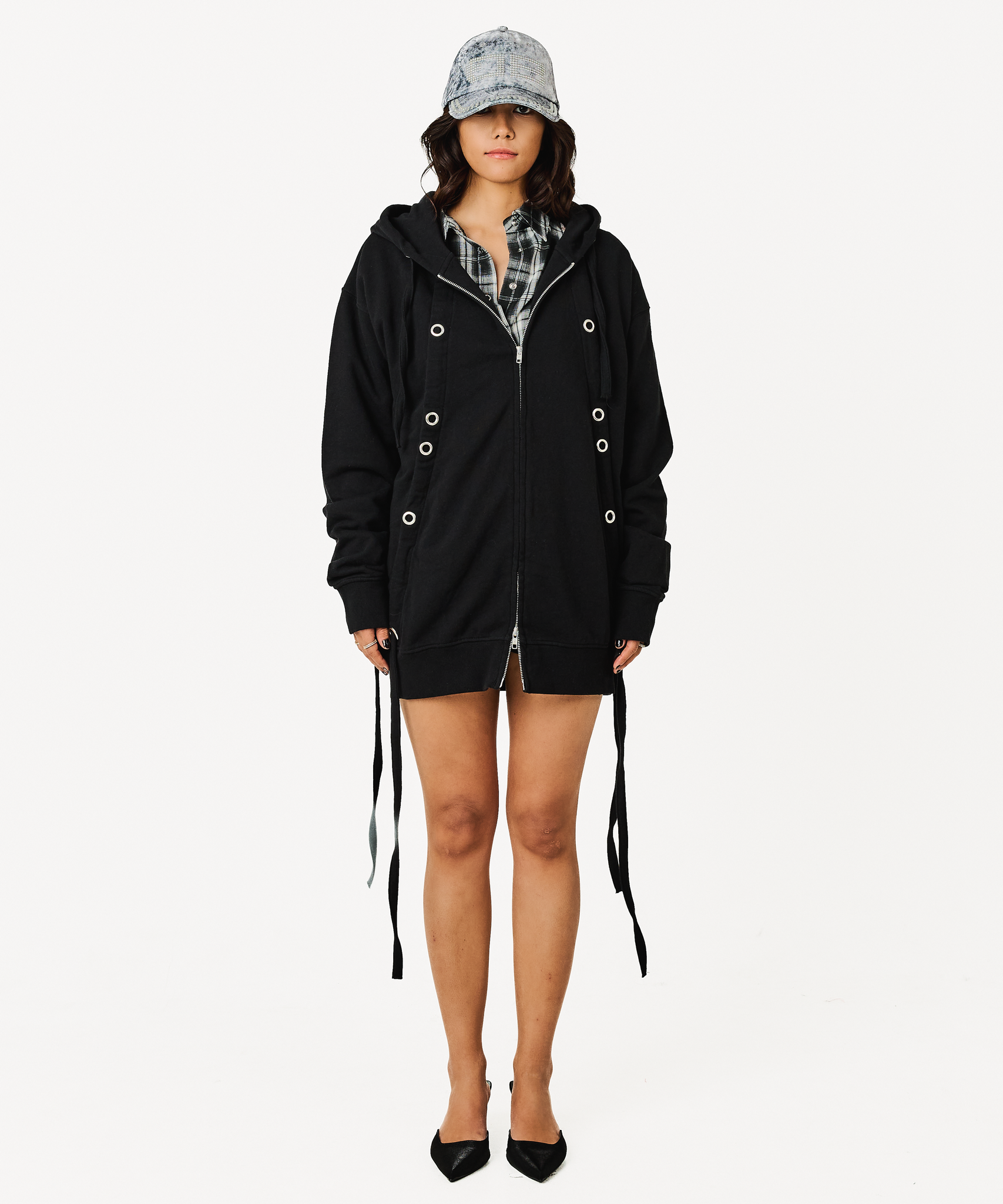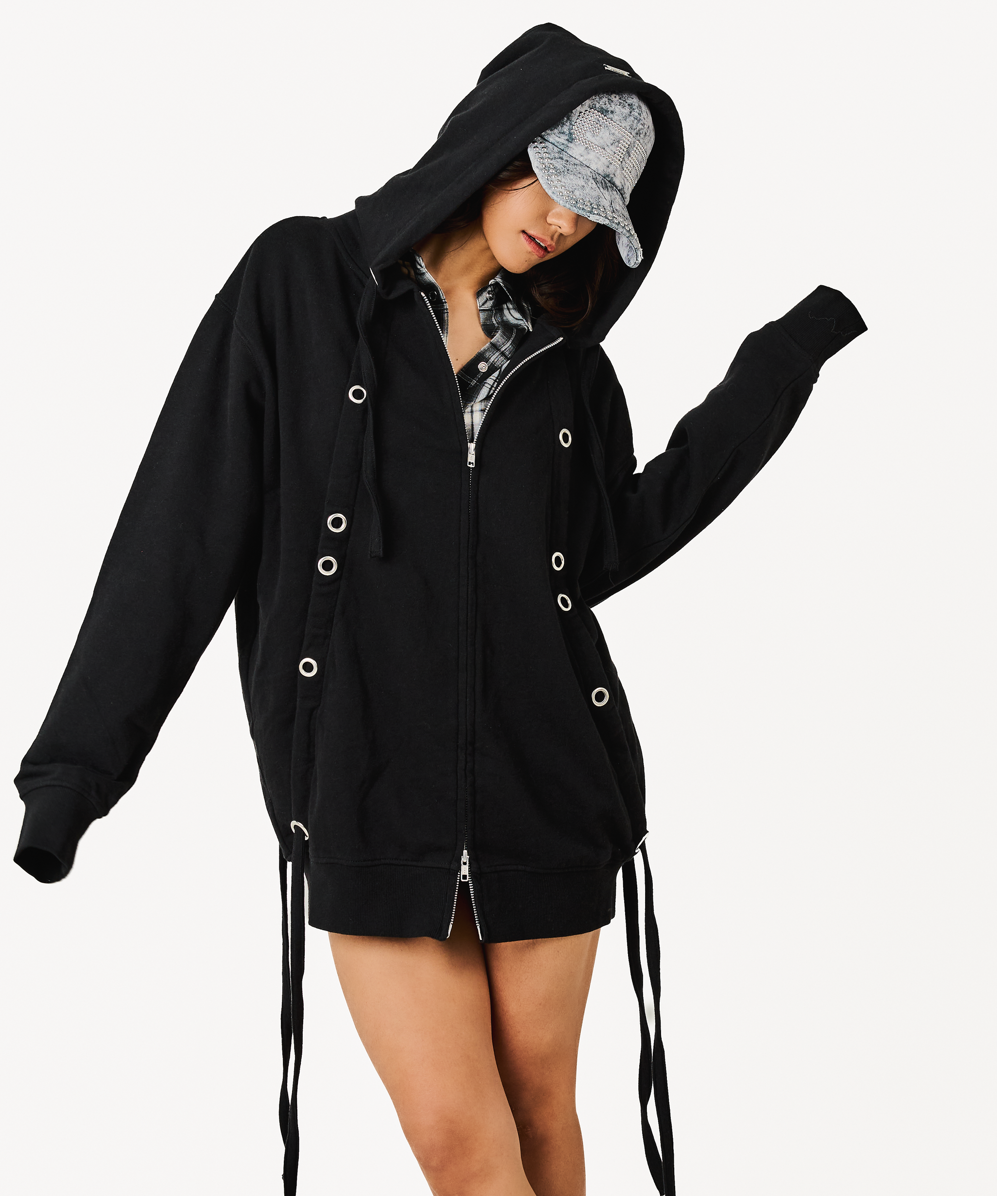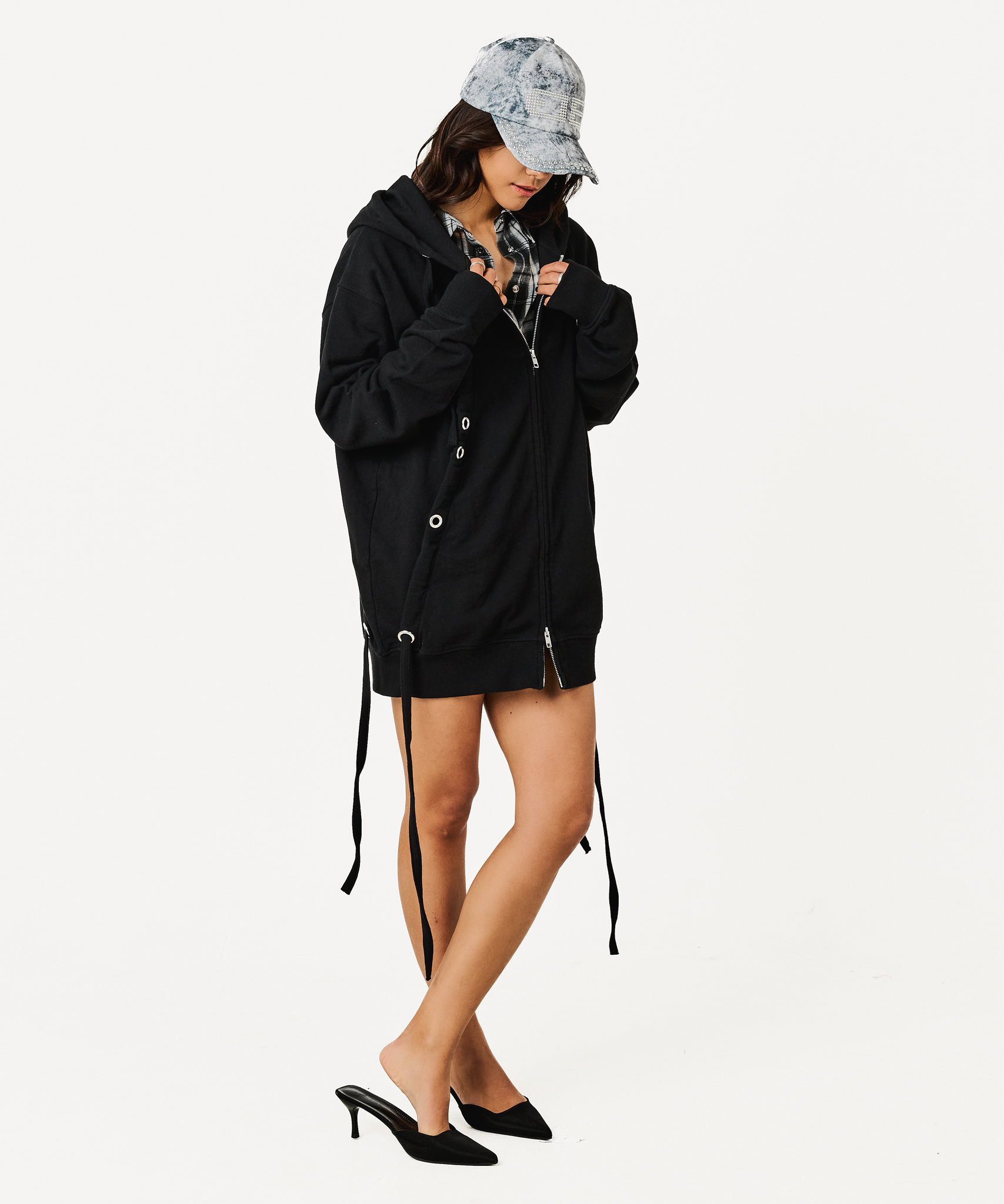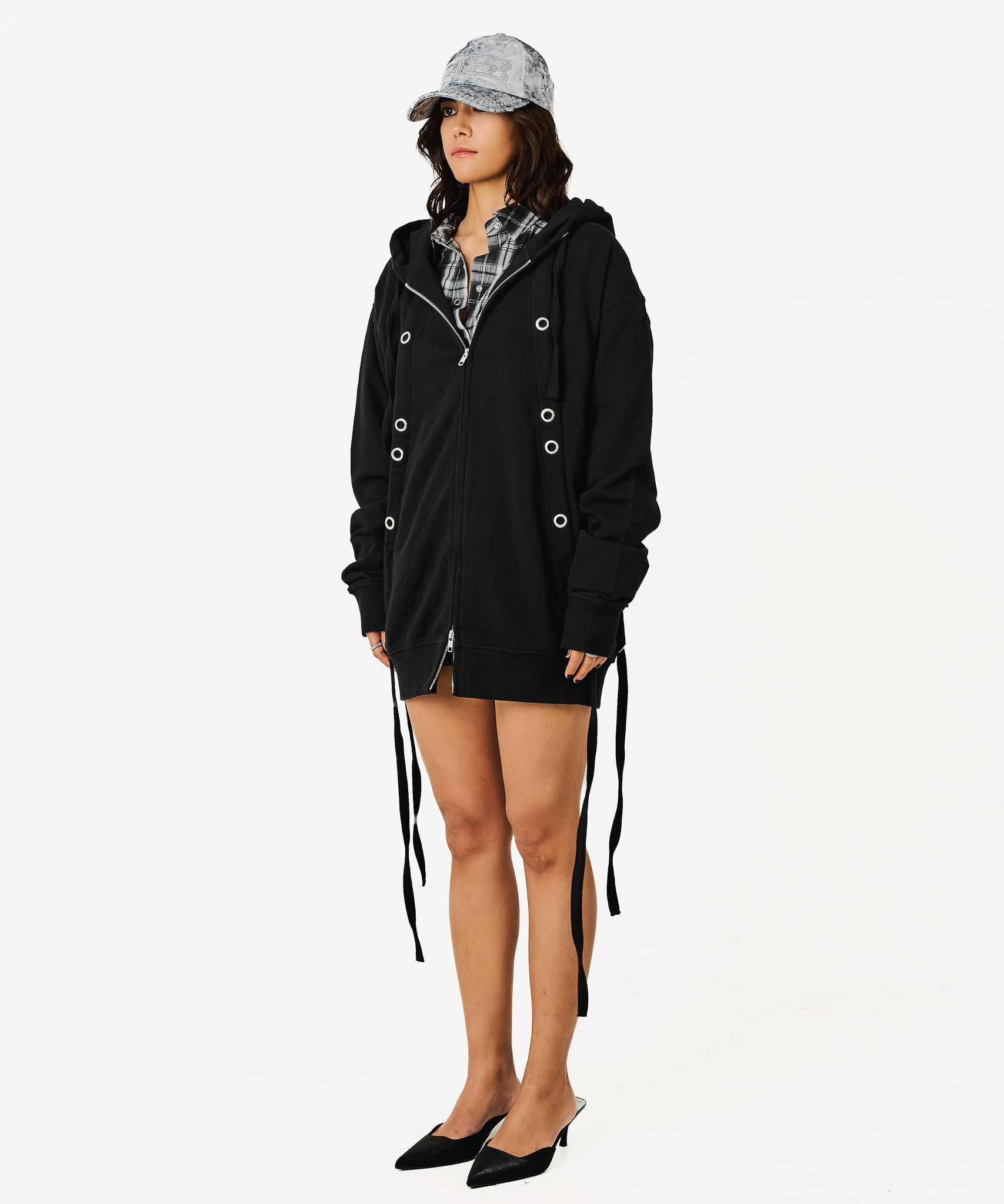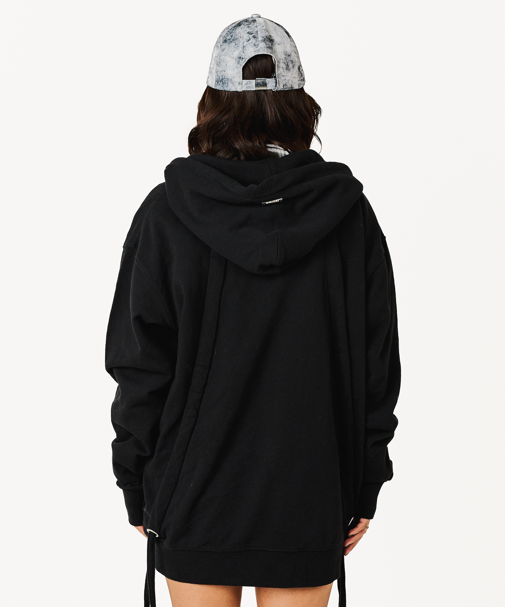 フロントとバック部分のギャザーがポイントのジップアップフーディー。