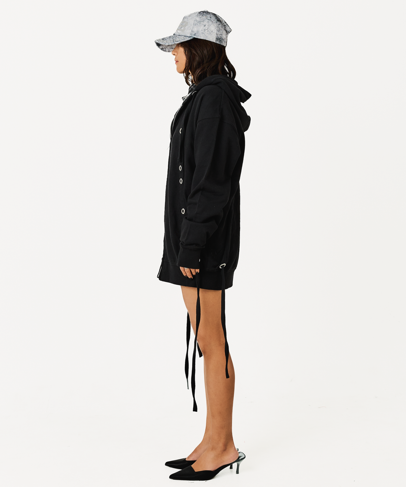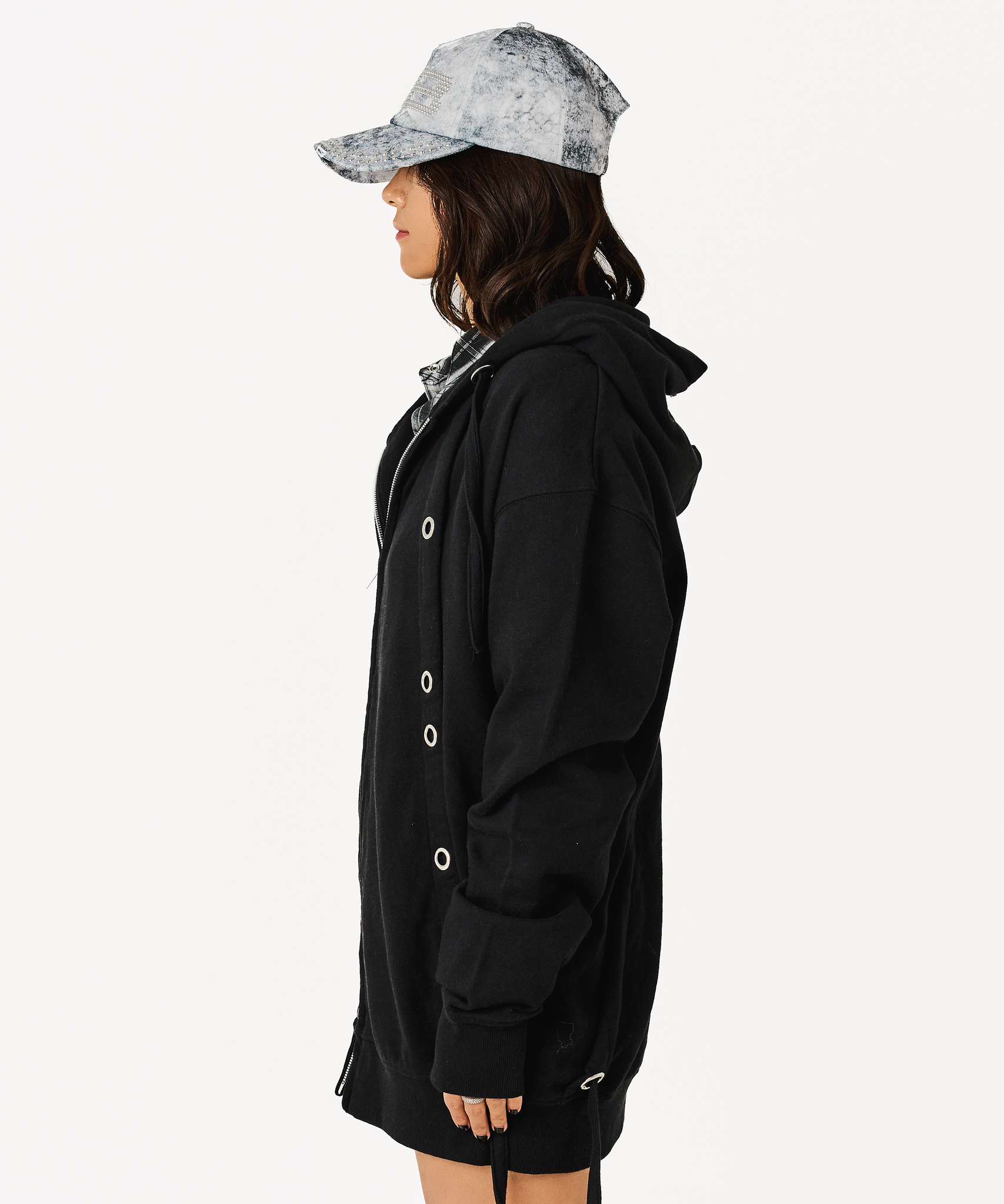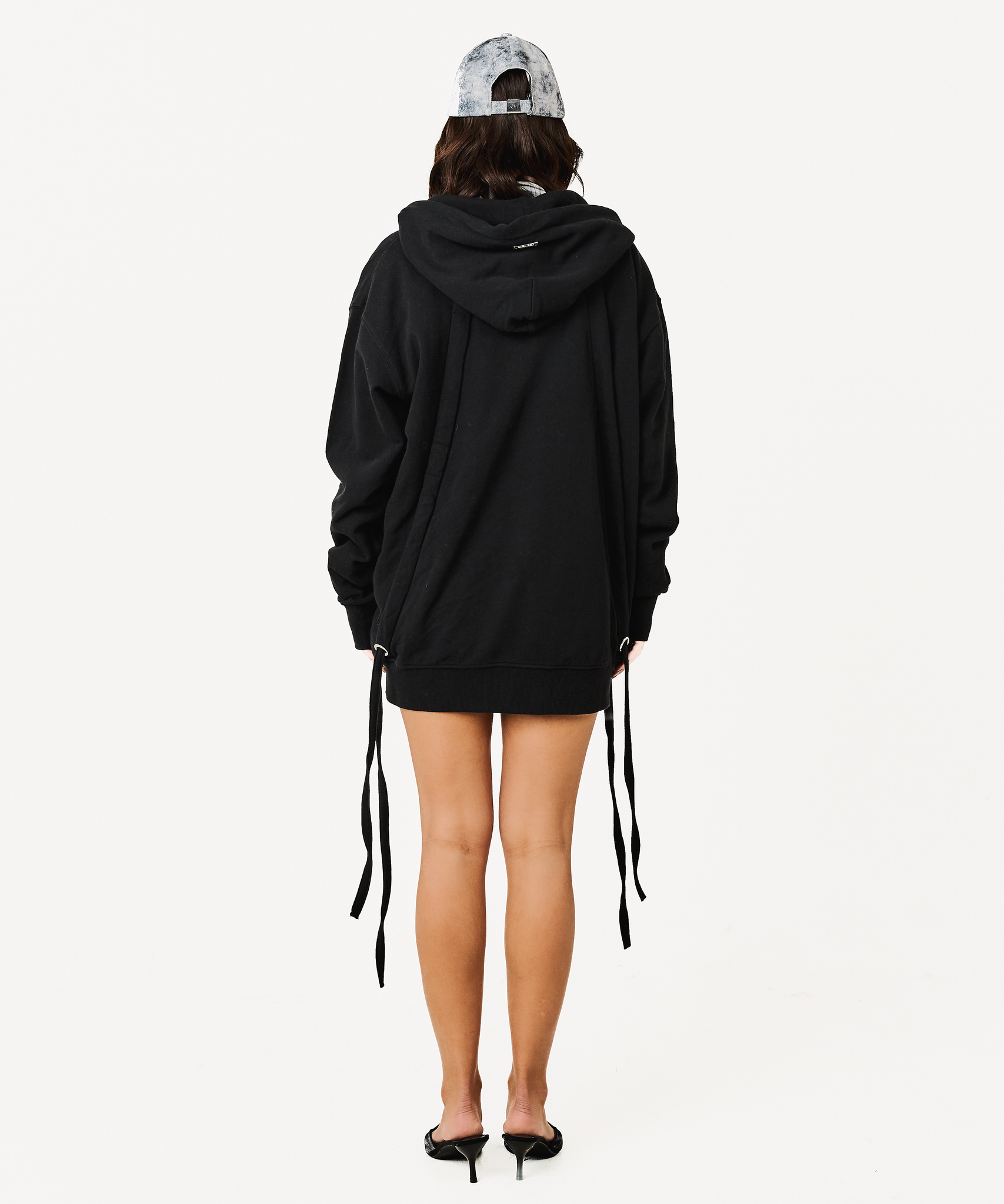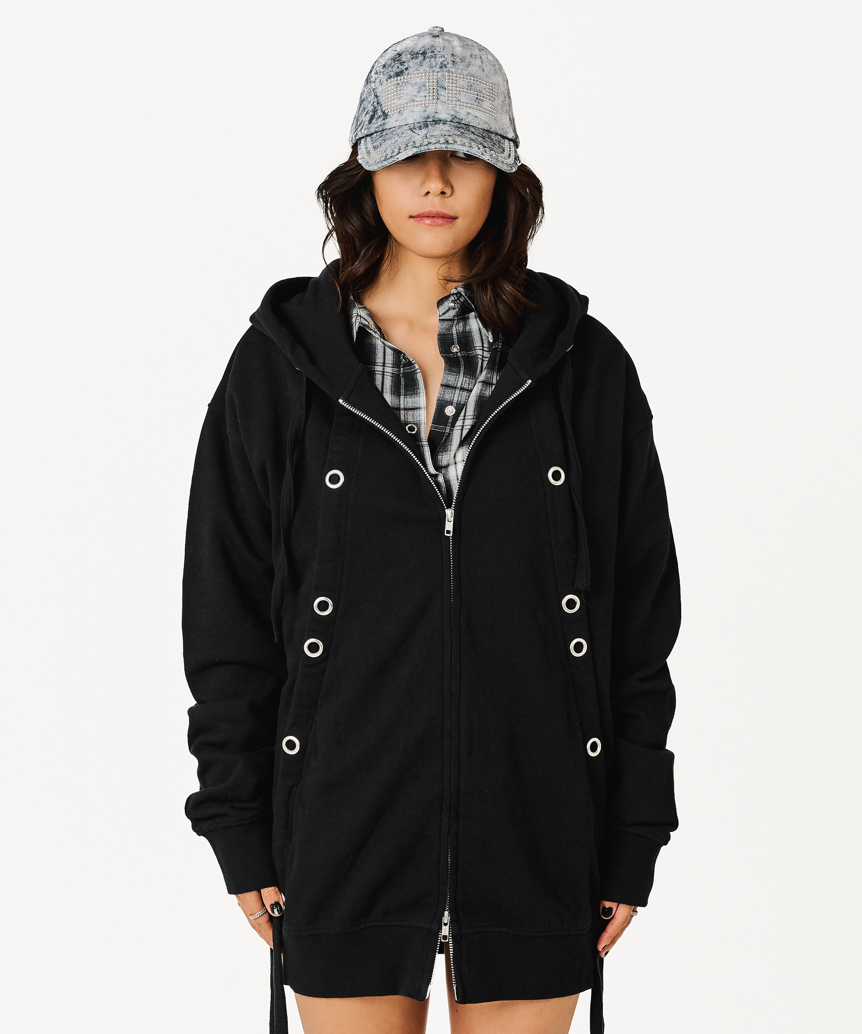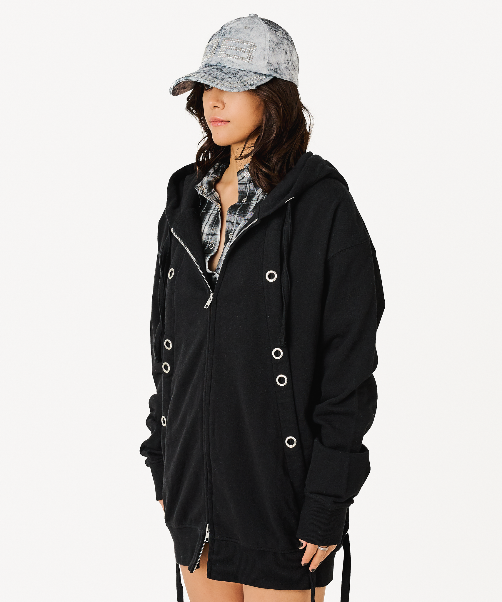 フロントとバック部分のギャザーがポイントのジップアップフーディー。