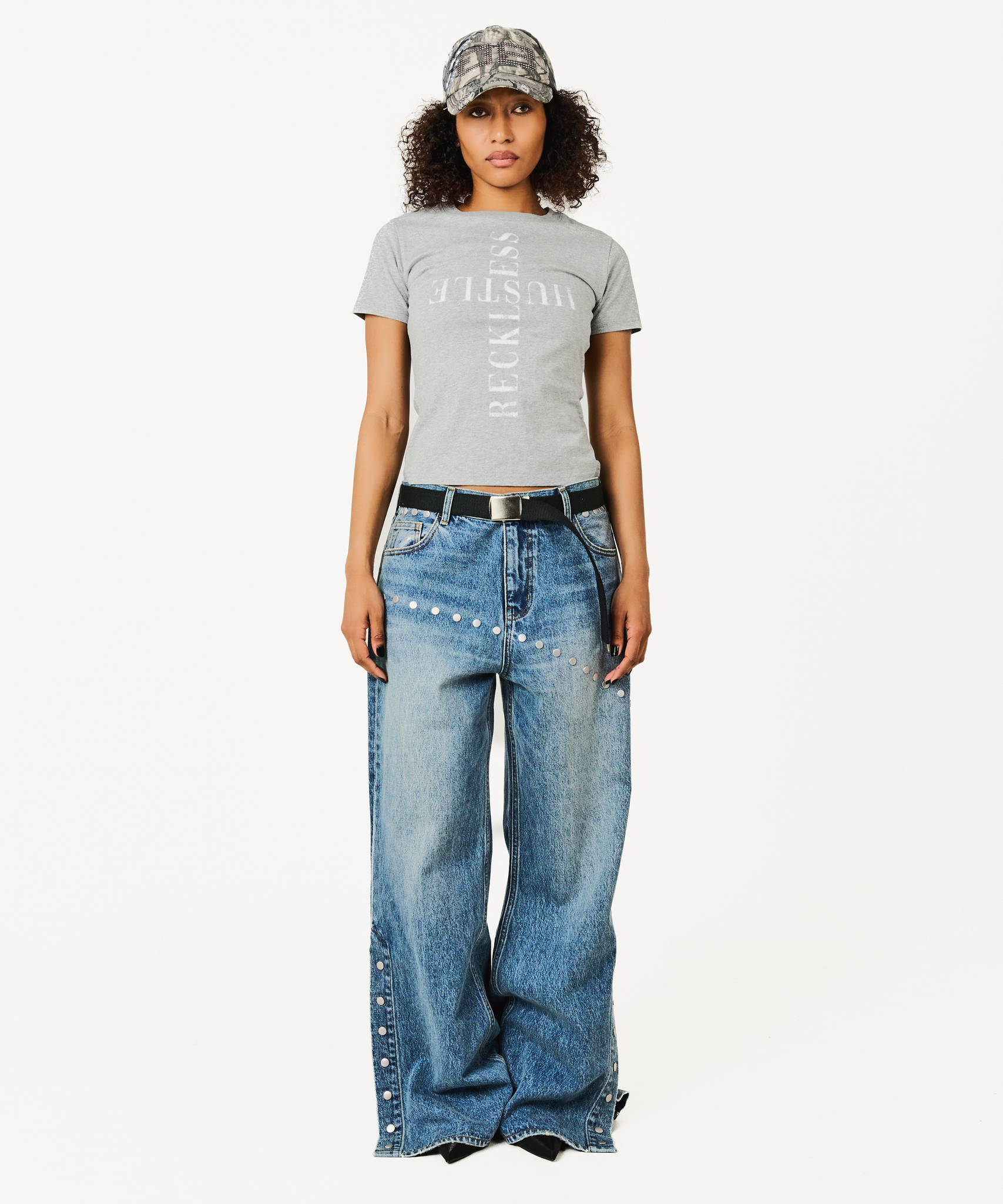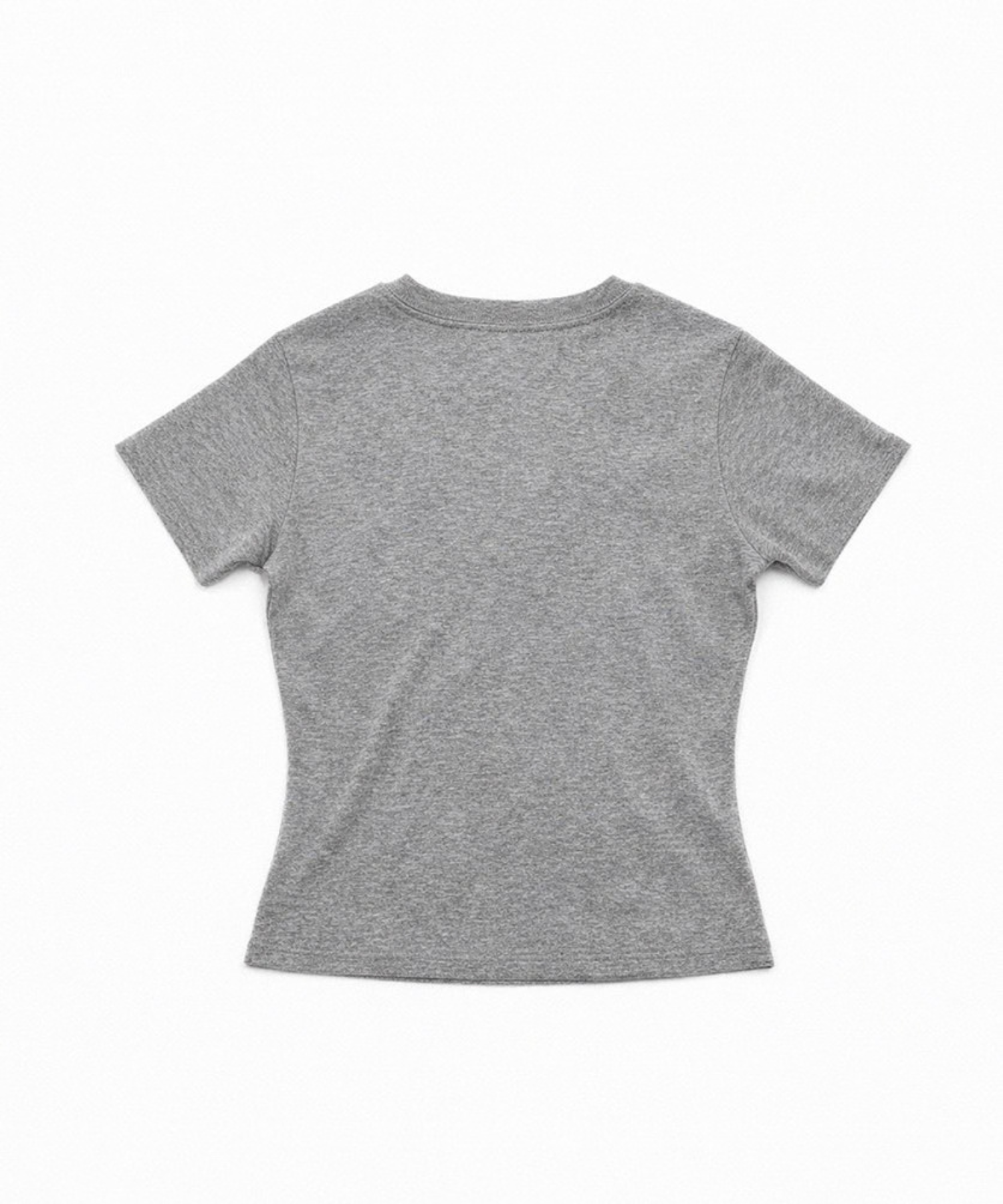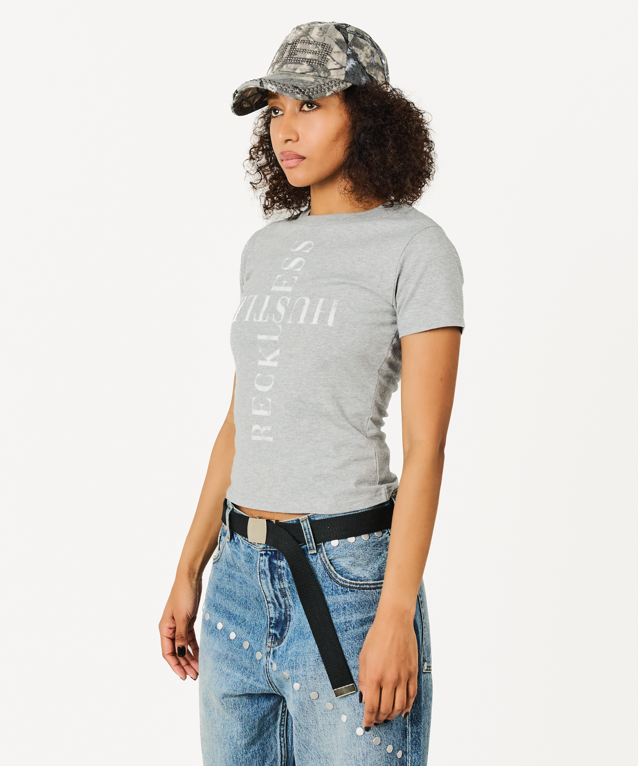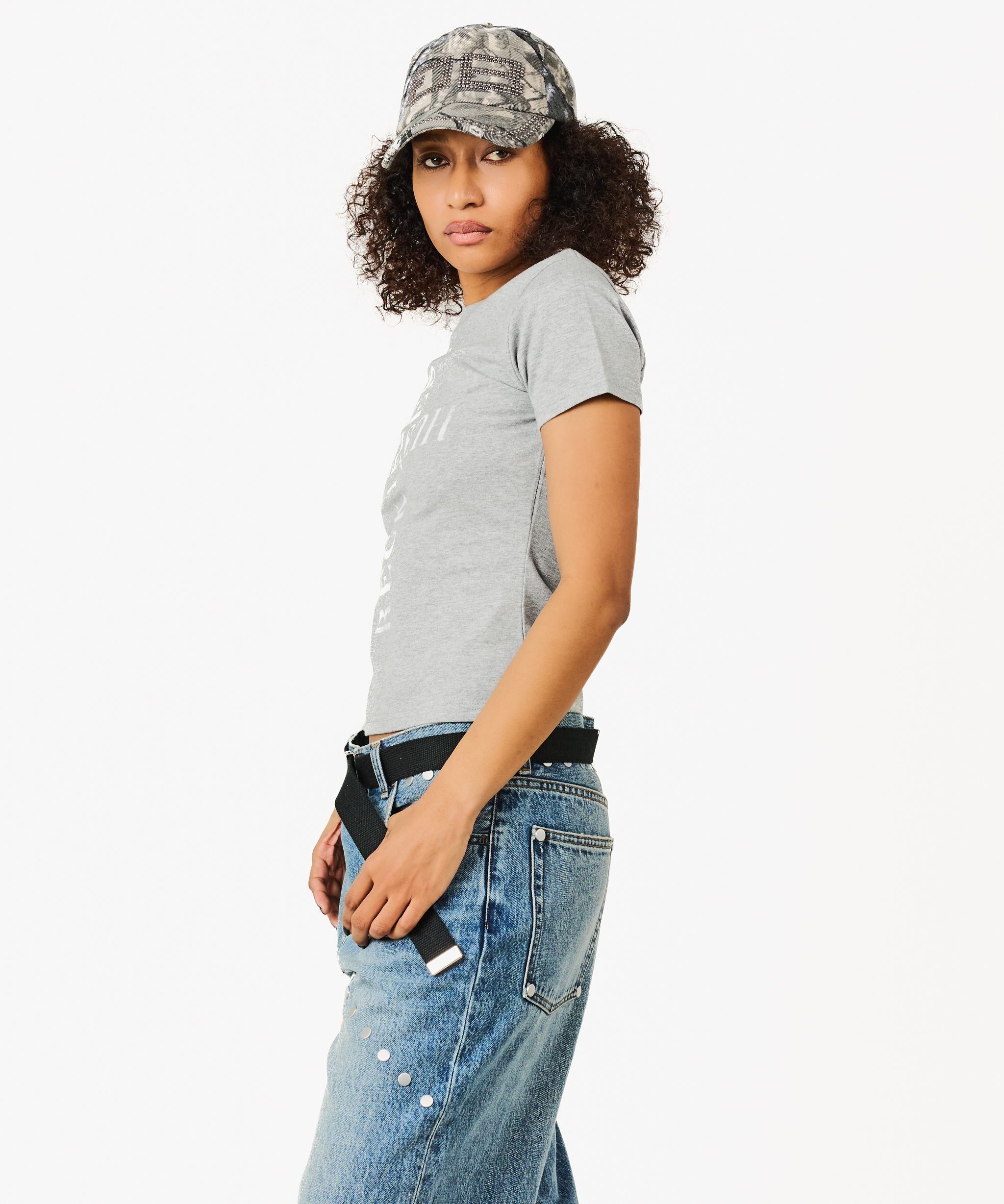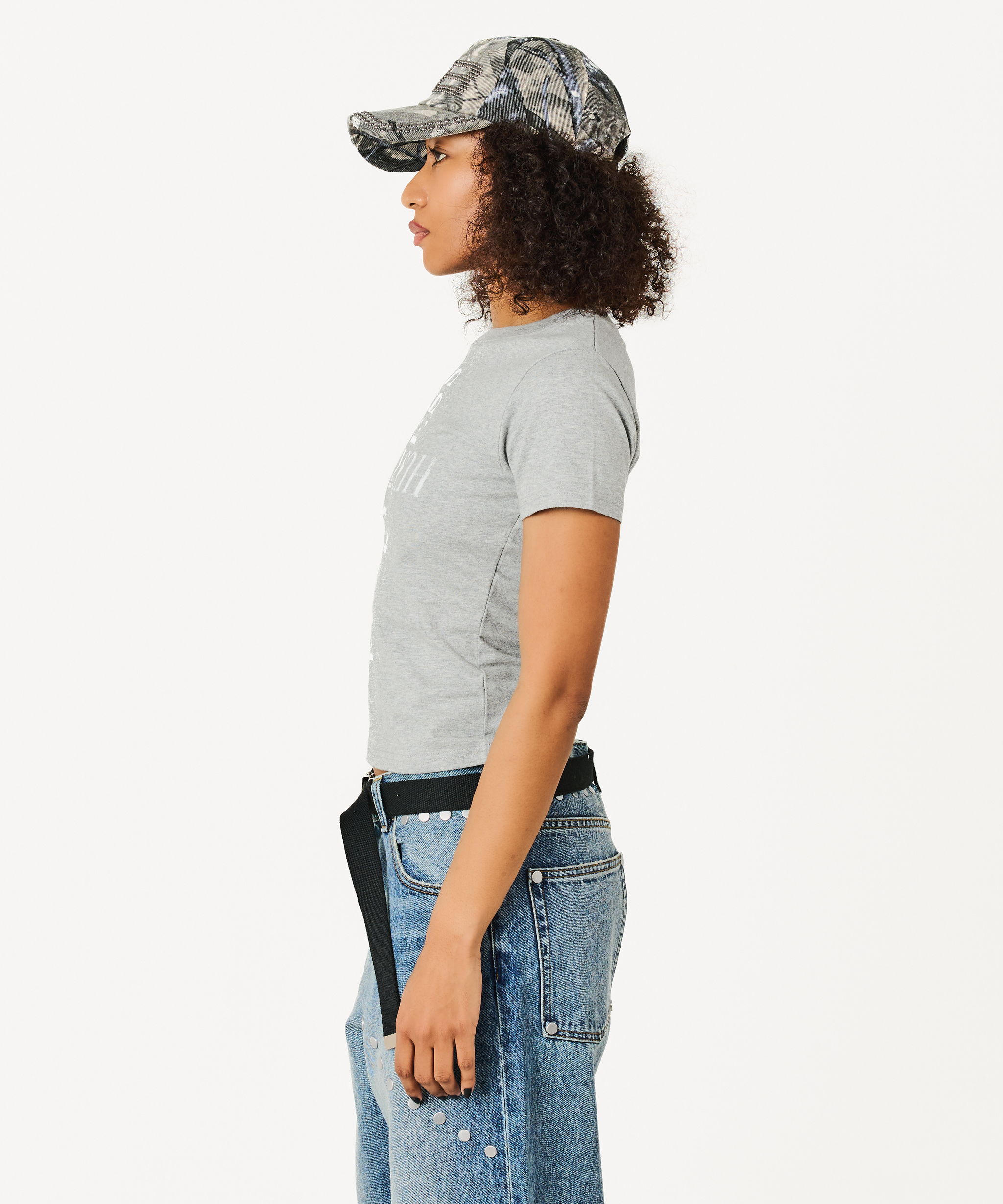 コンパクトなシルエットに、クロスレイアウトのロゴグラフィックが映えるデザインTシャツ。