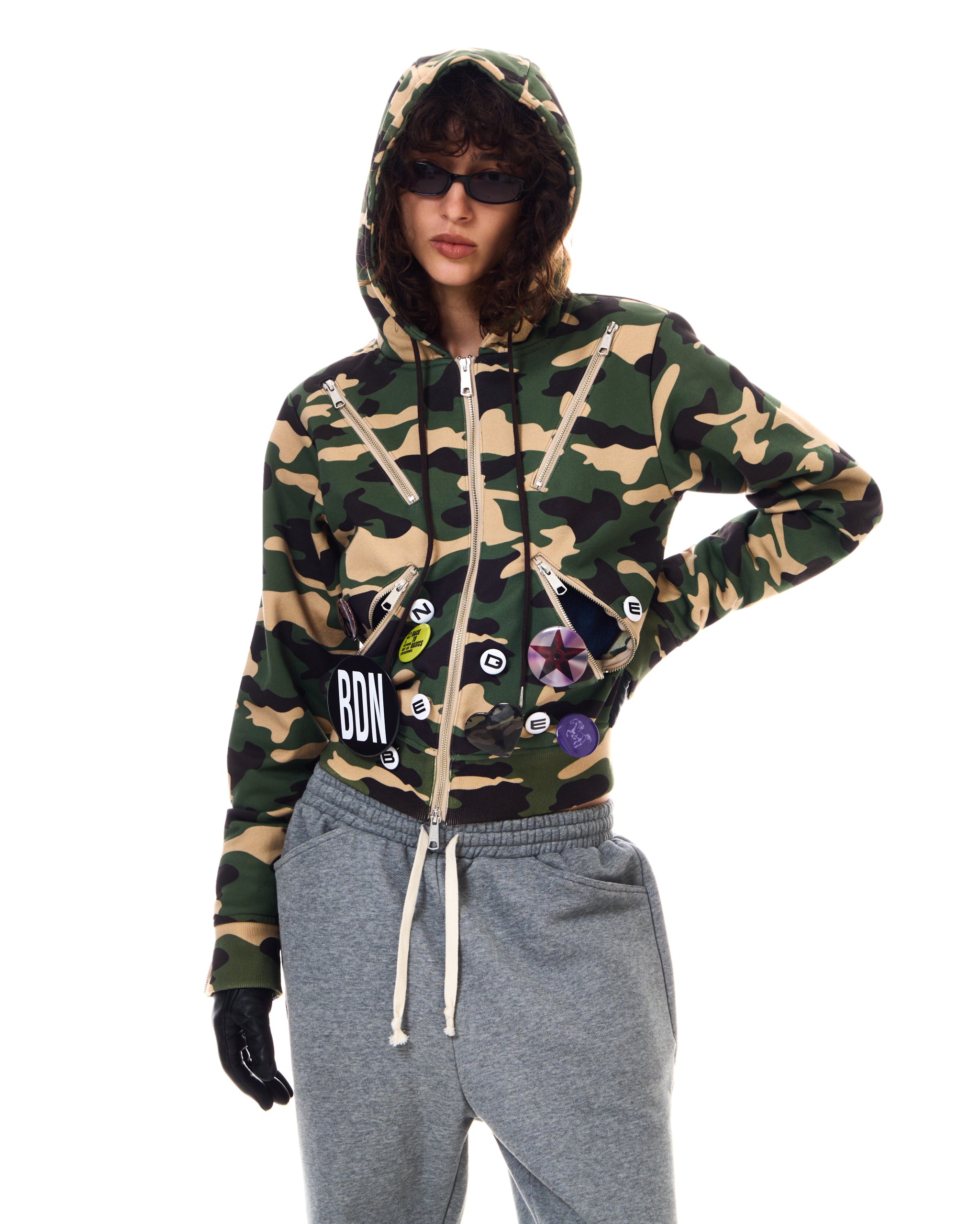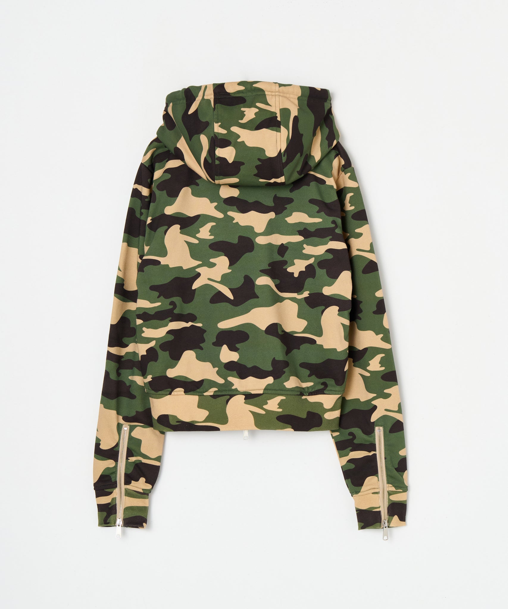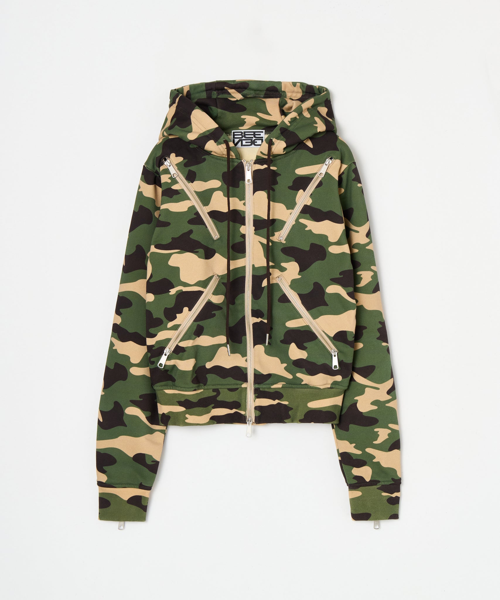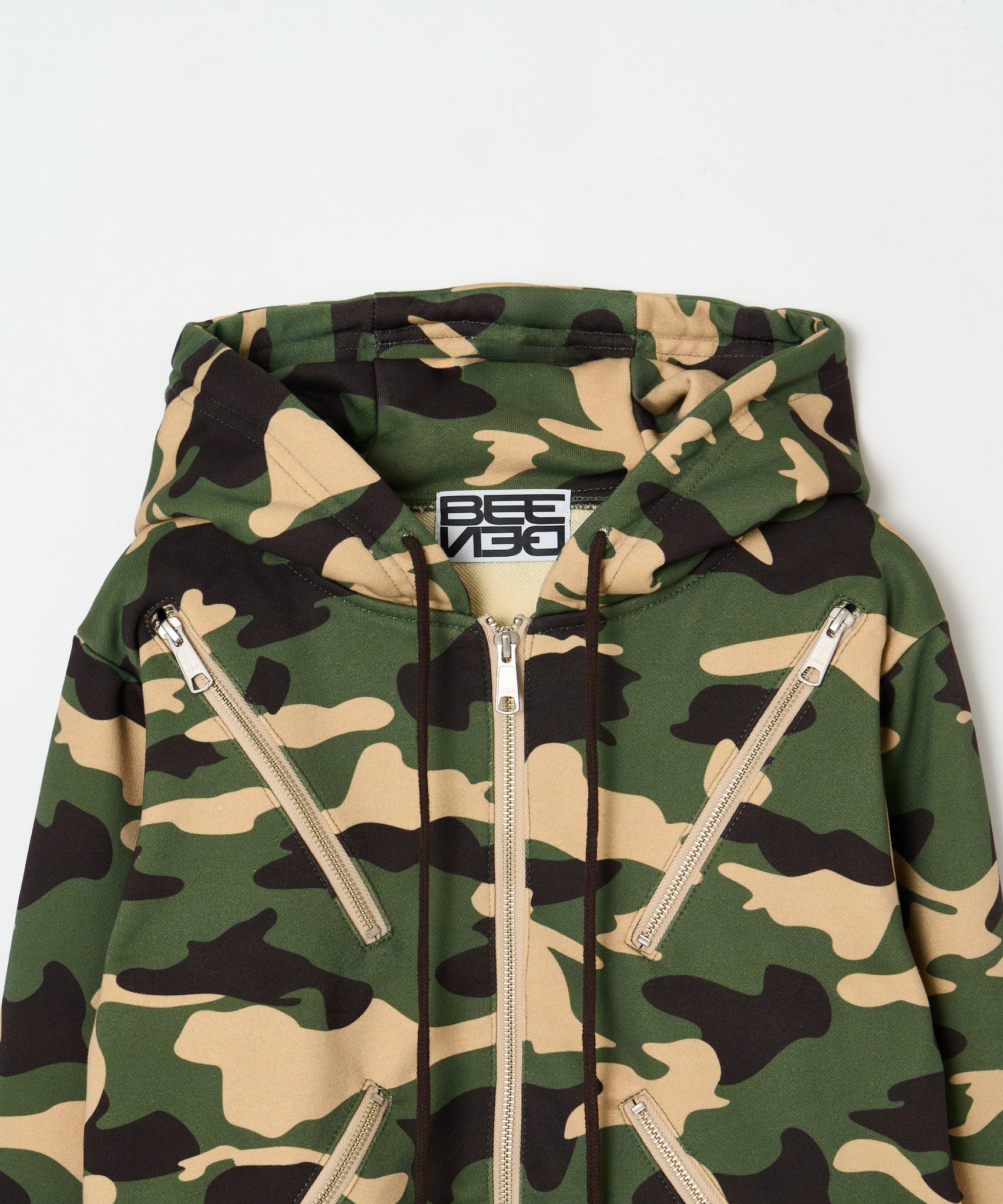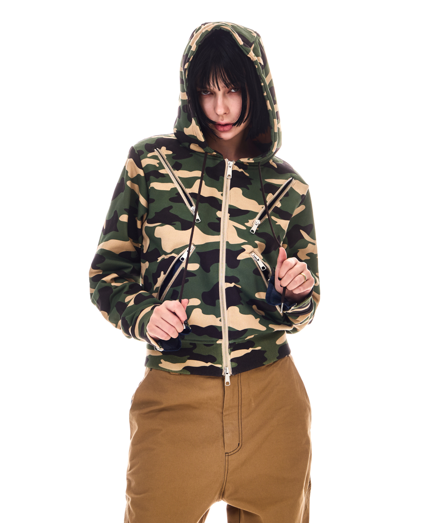 フロントと袖に施されたジップデザインが斬新なジップアップフーディー。