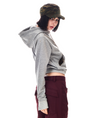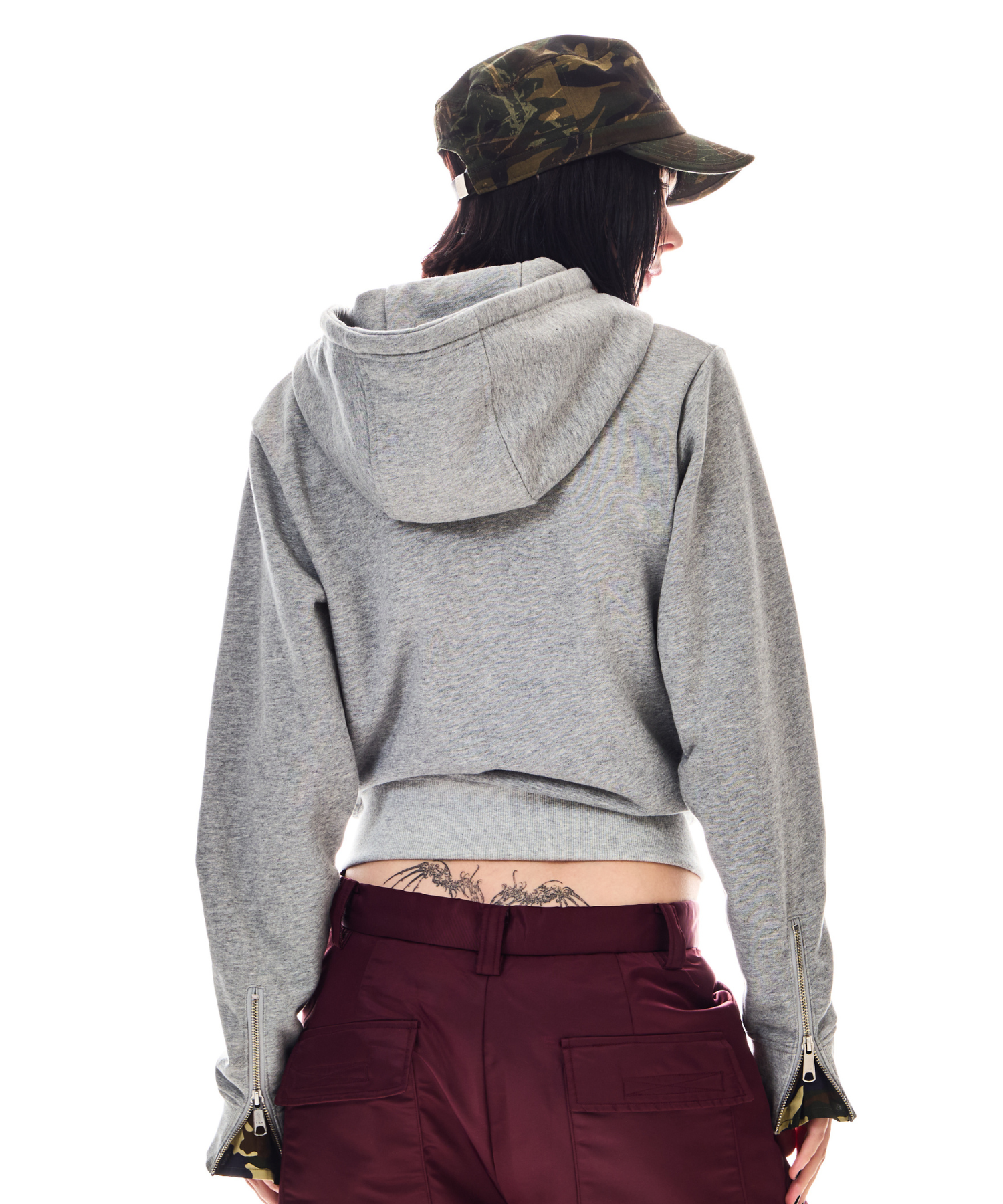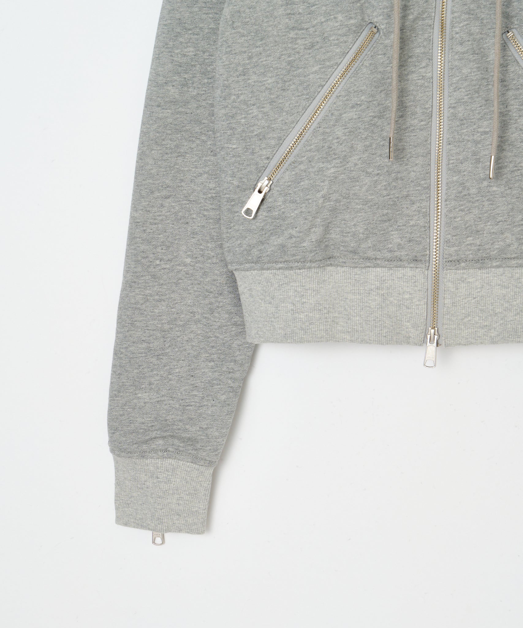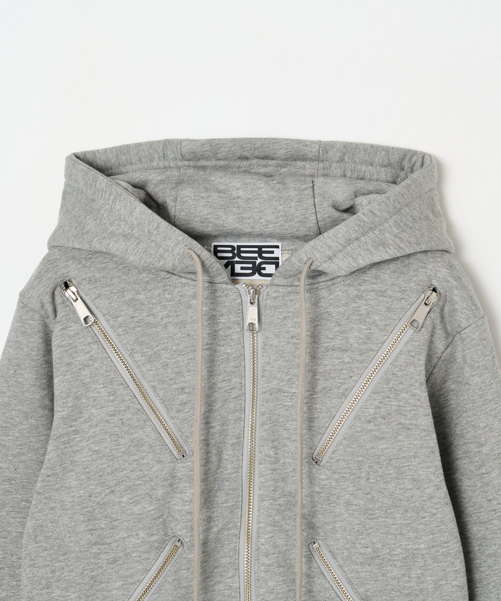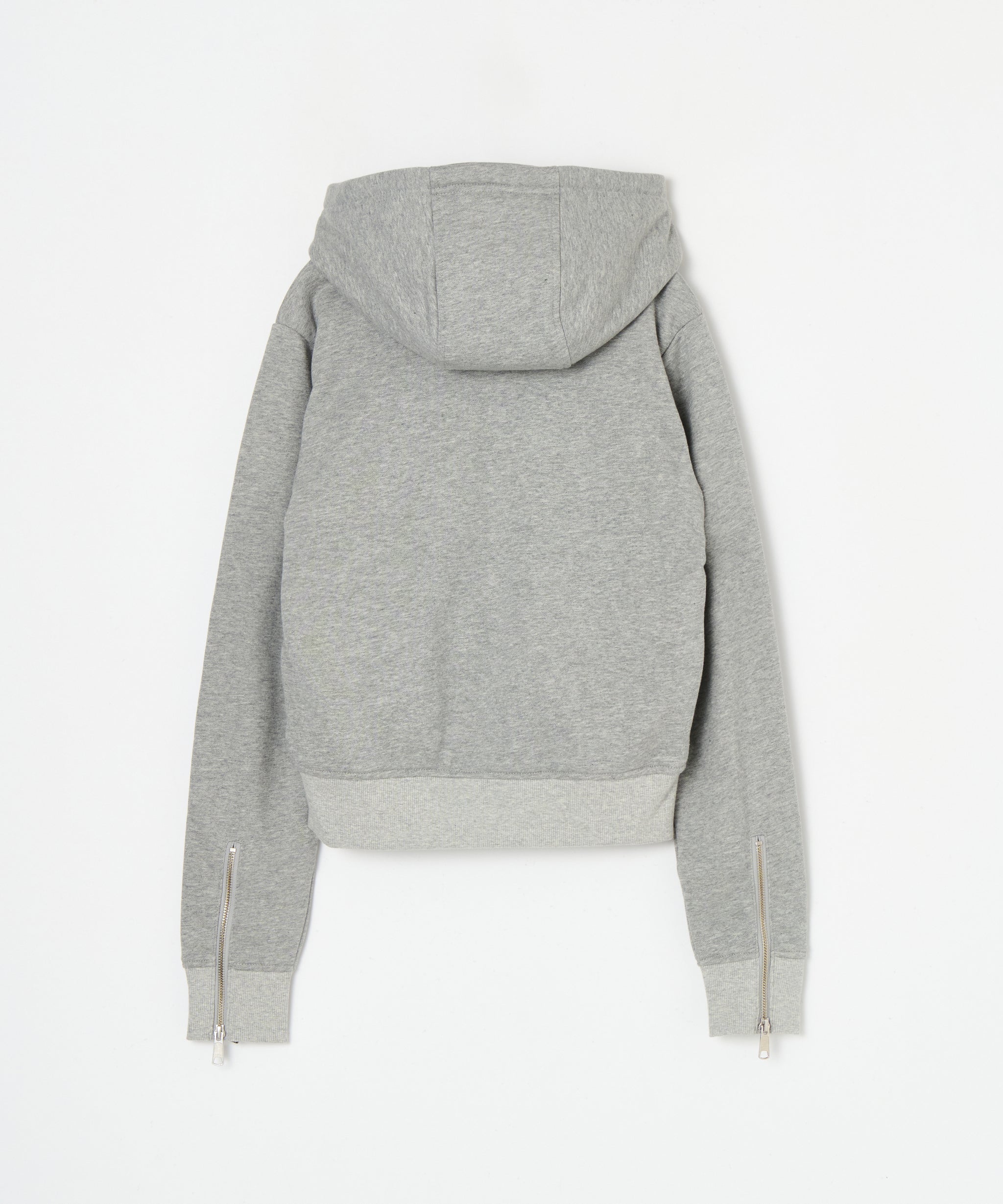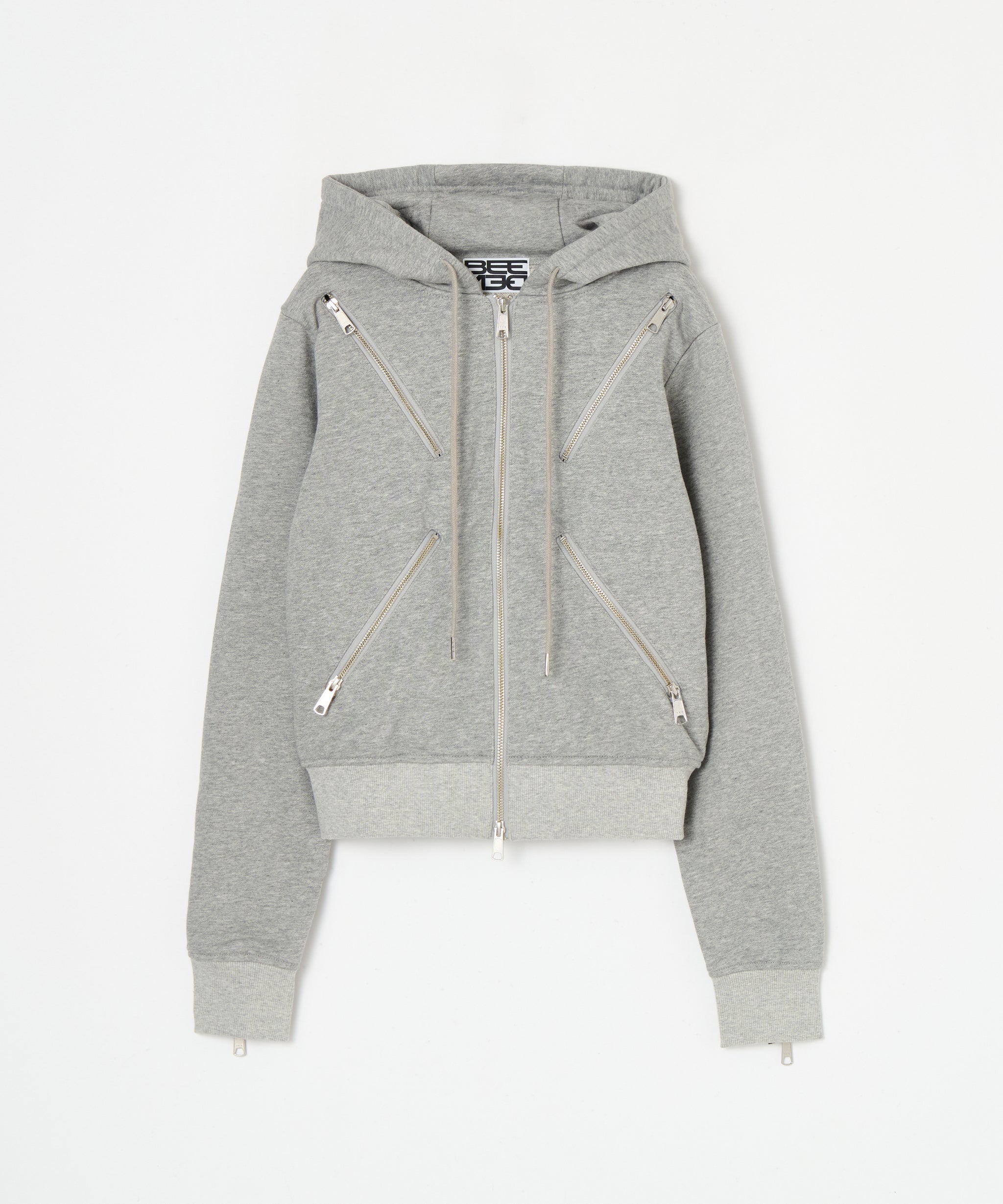 フロントと袖に施されたジップデザインが斬新なジップアップフーディー。