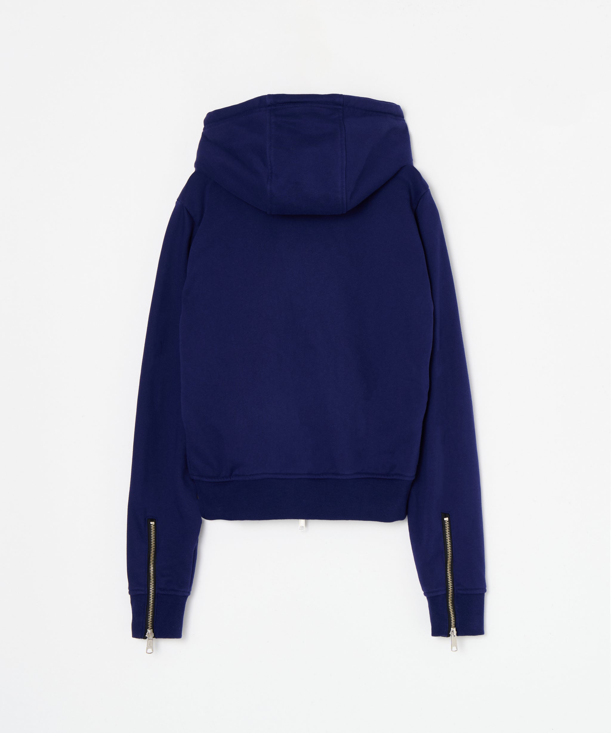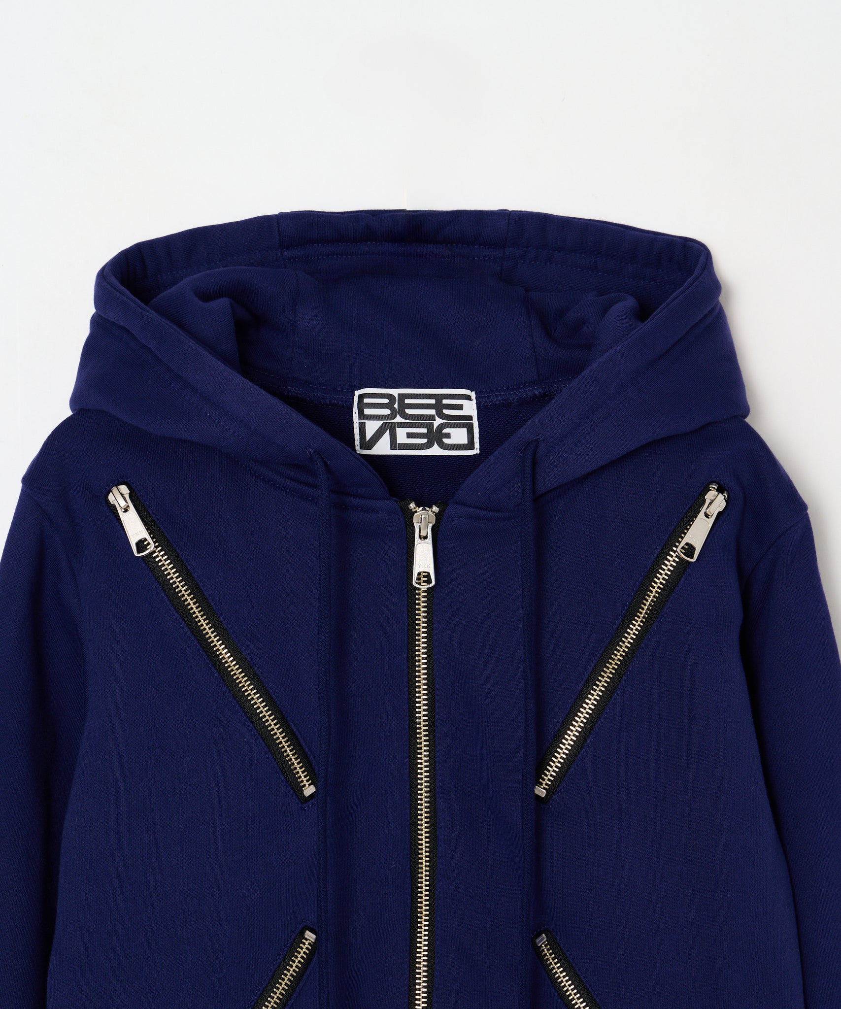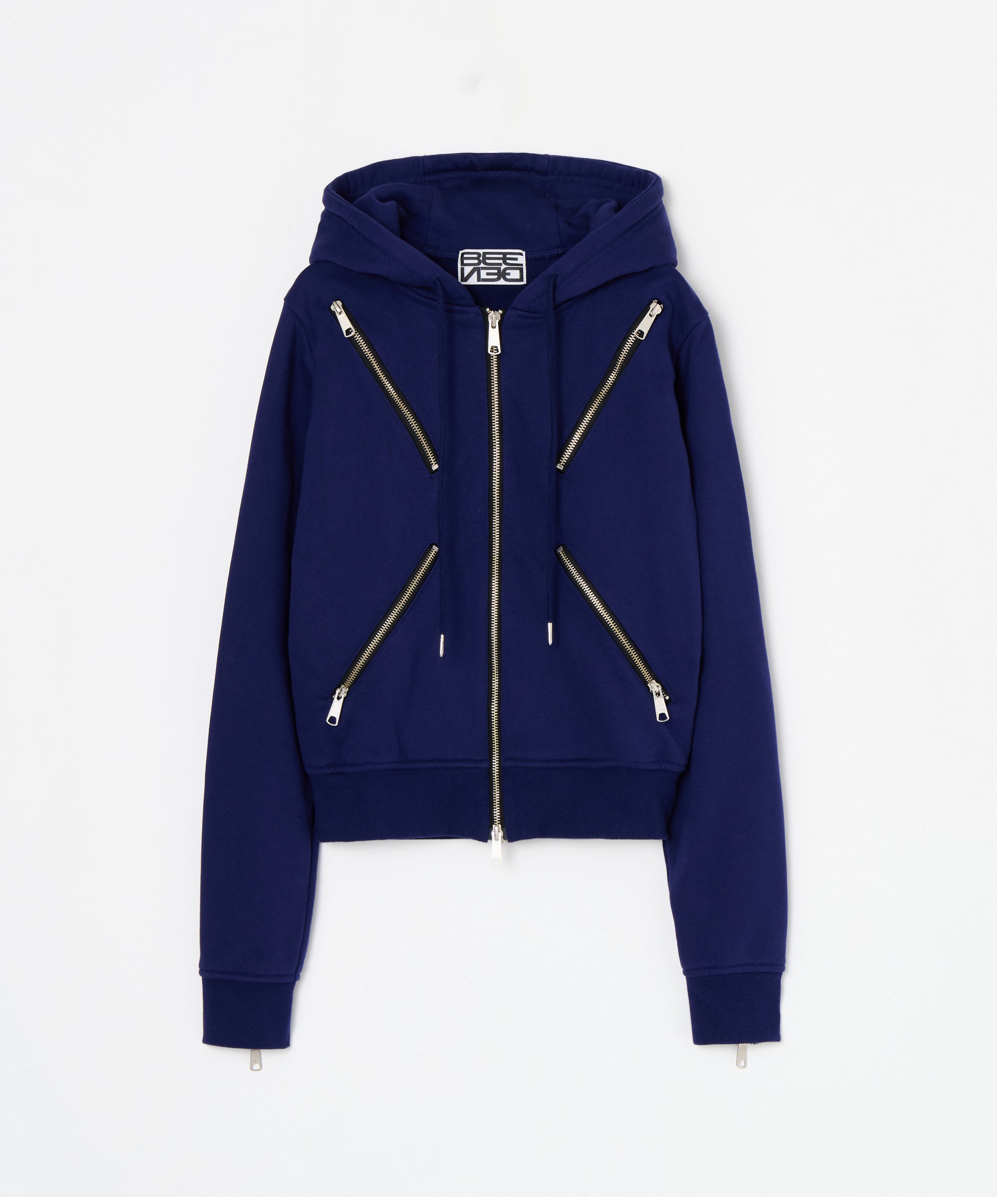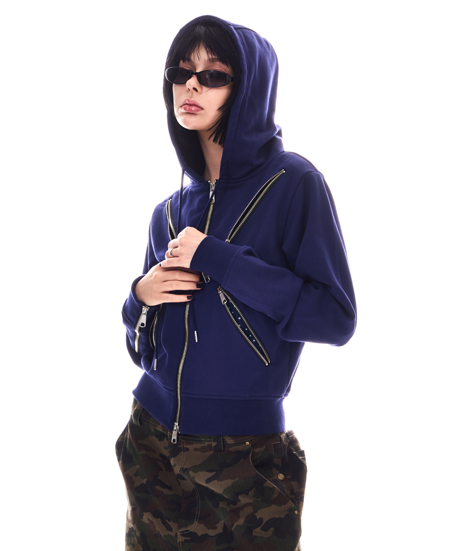 フロントと袖に施されたジップデザインが斬新なジップアップフーディー。