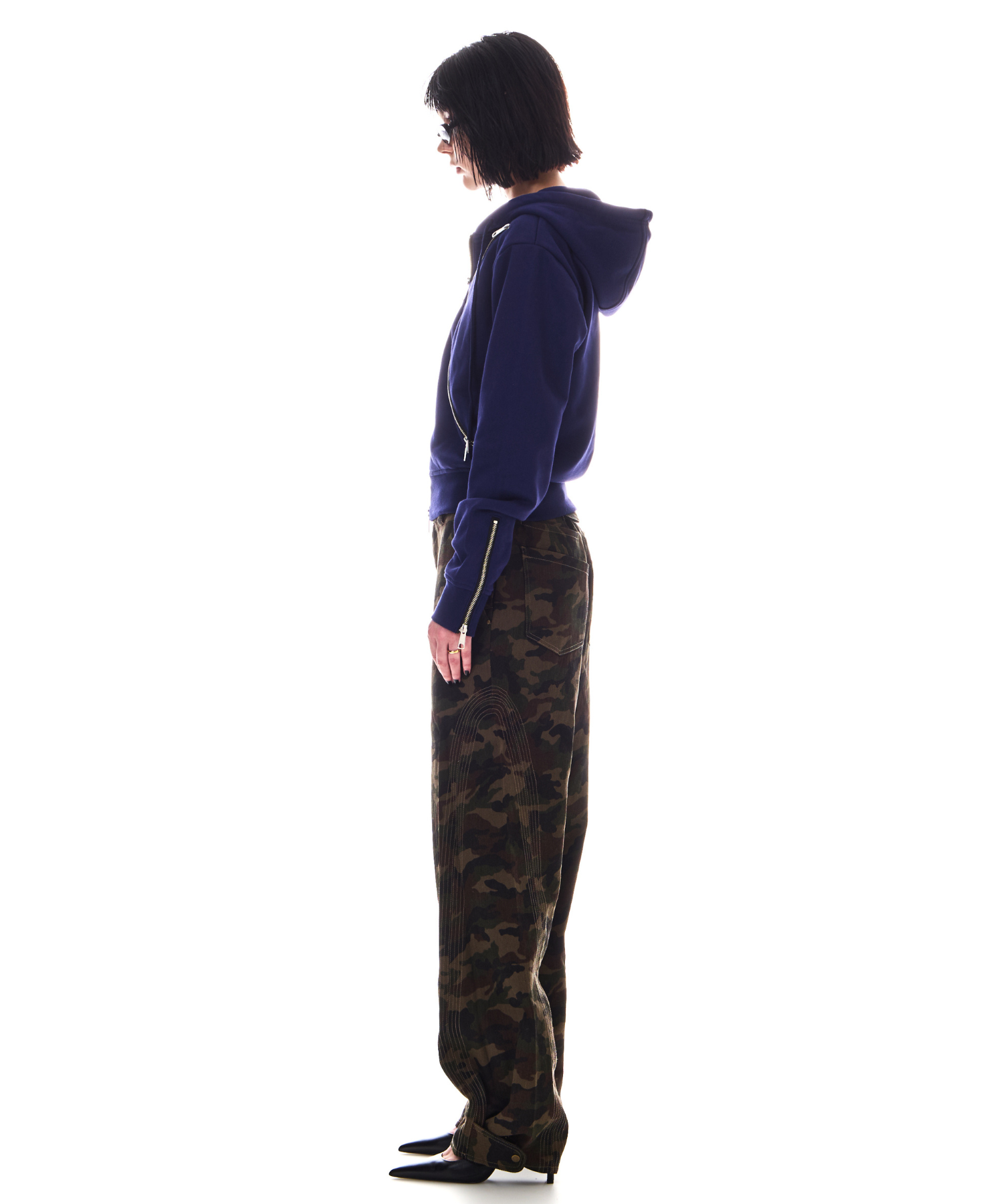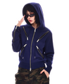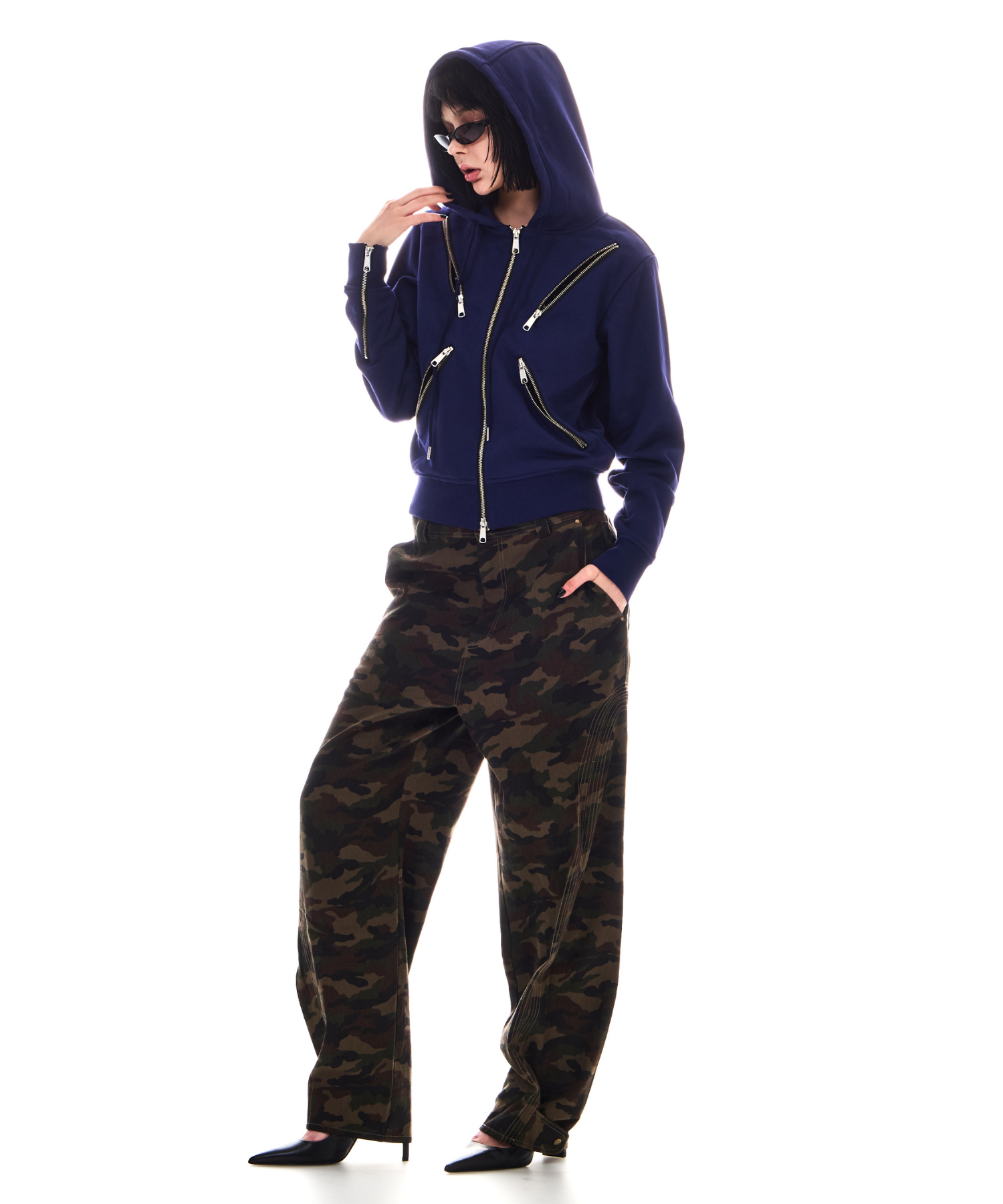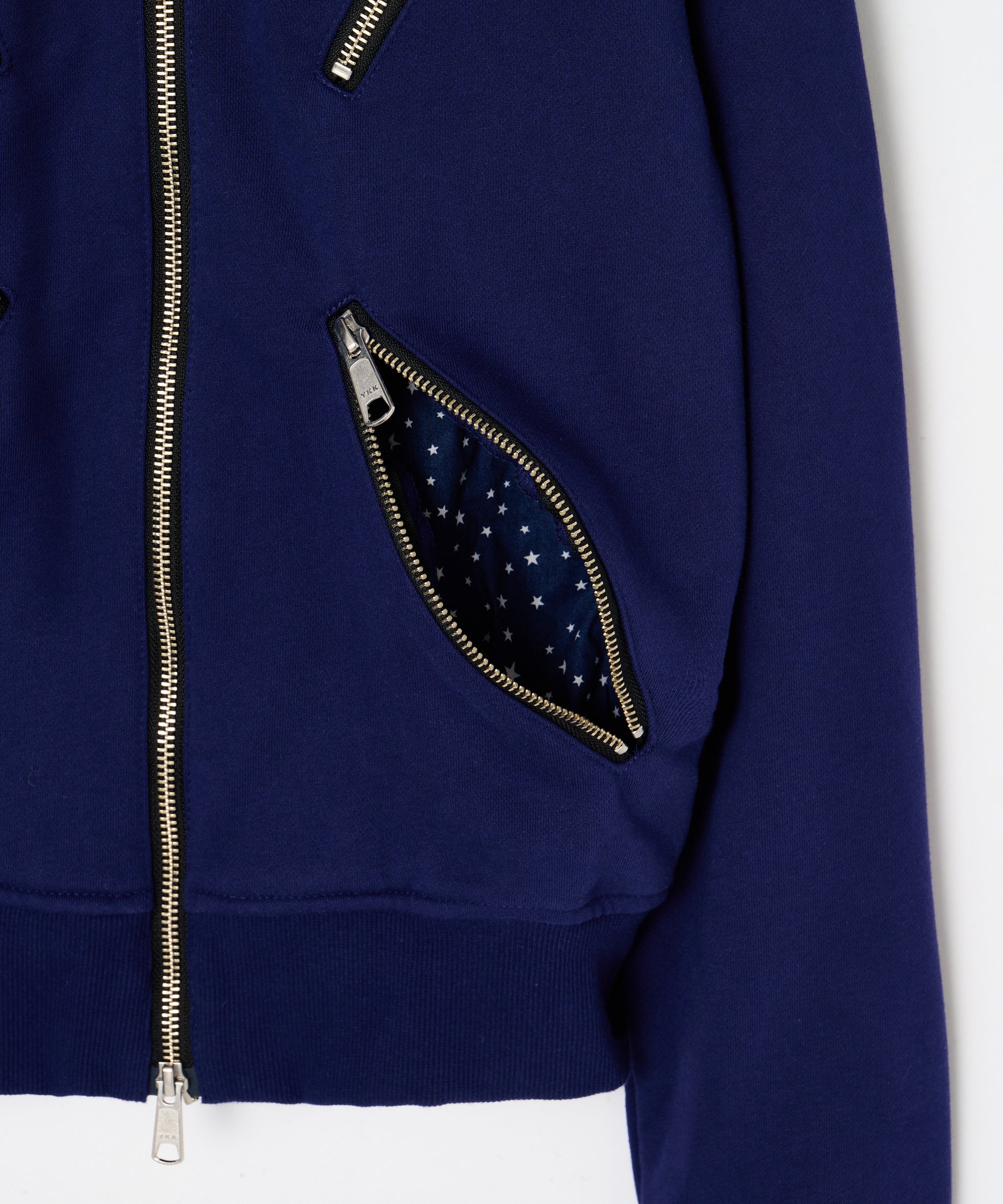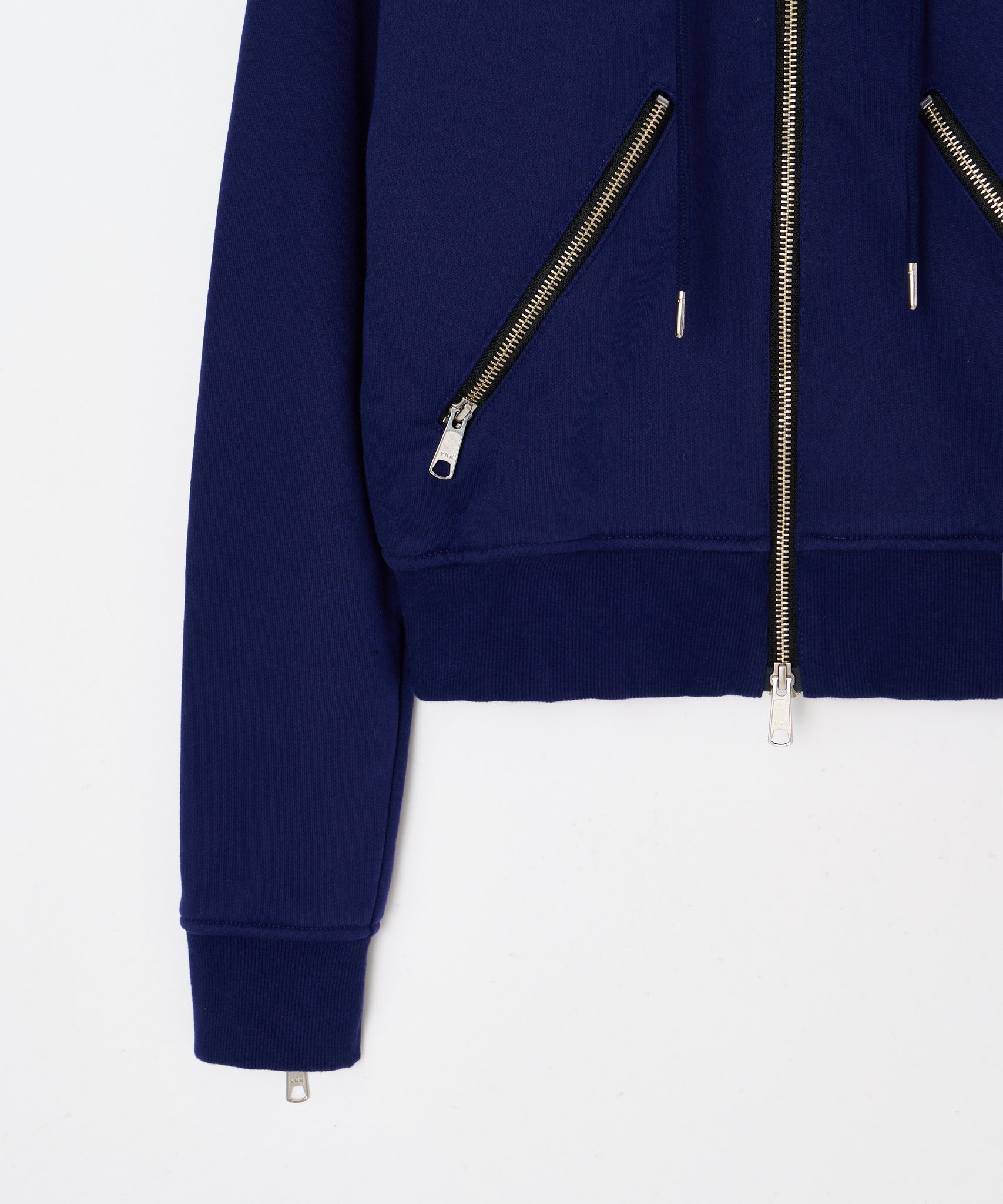 フロントと袖に施されたジップデザインが斬新なジップアップフーディー。