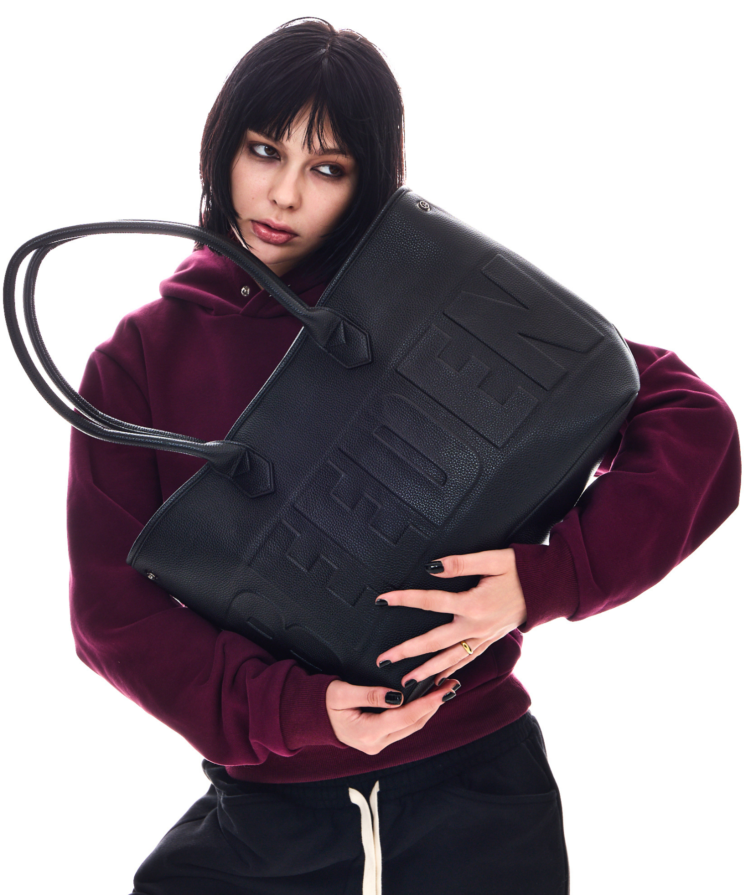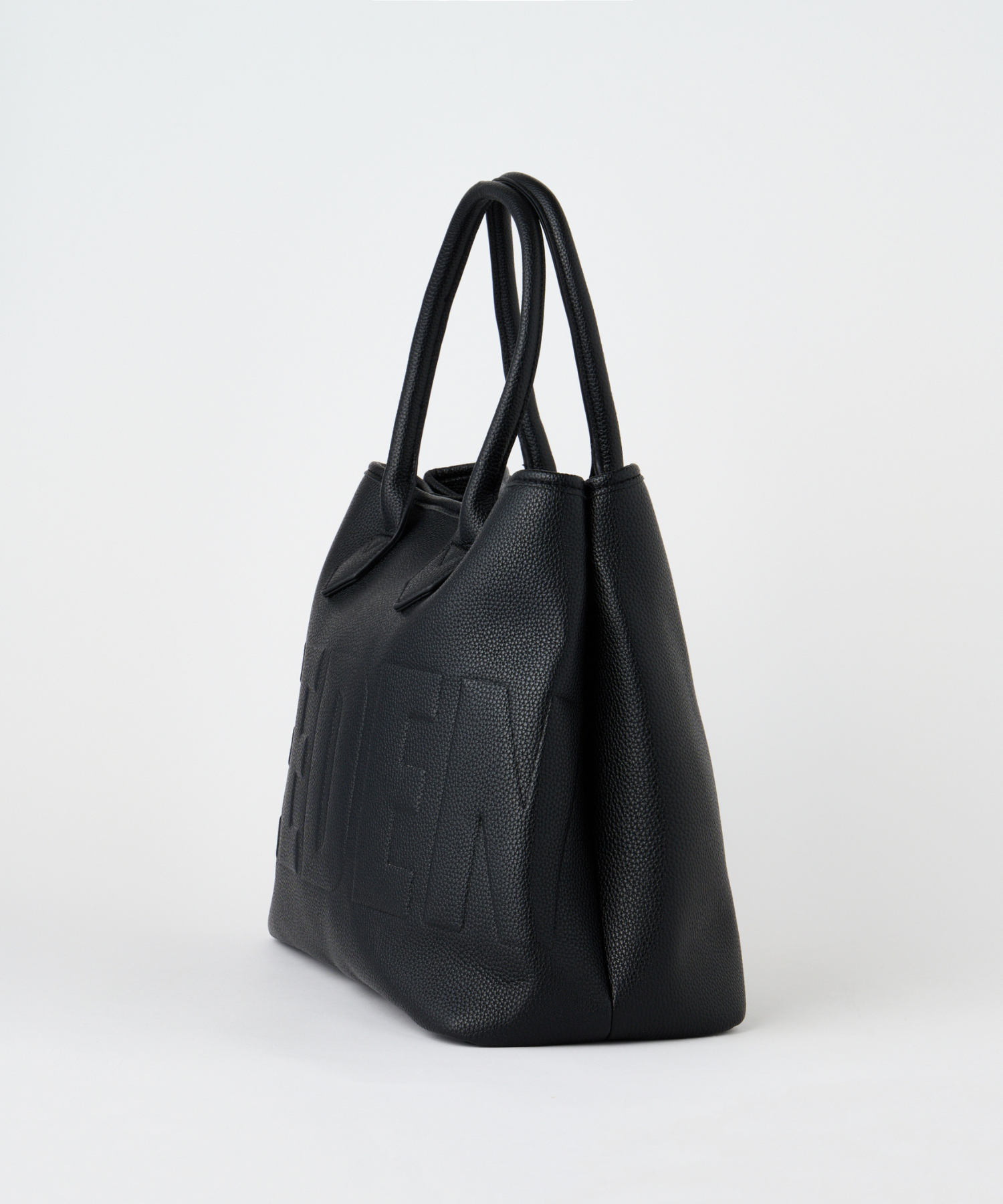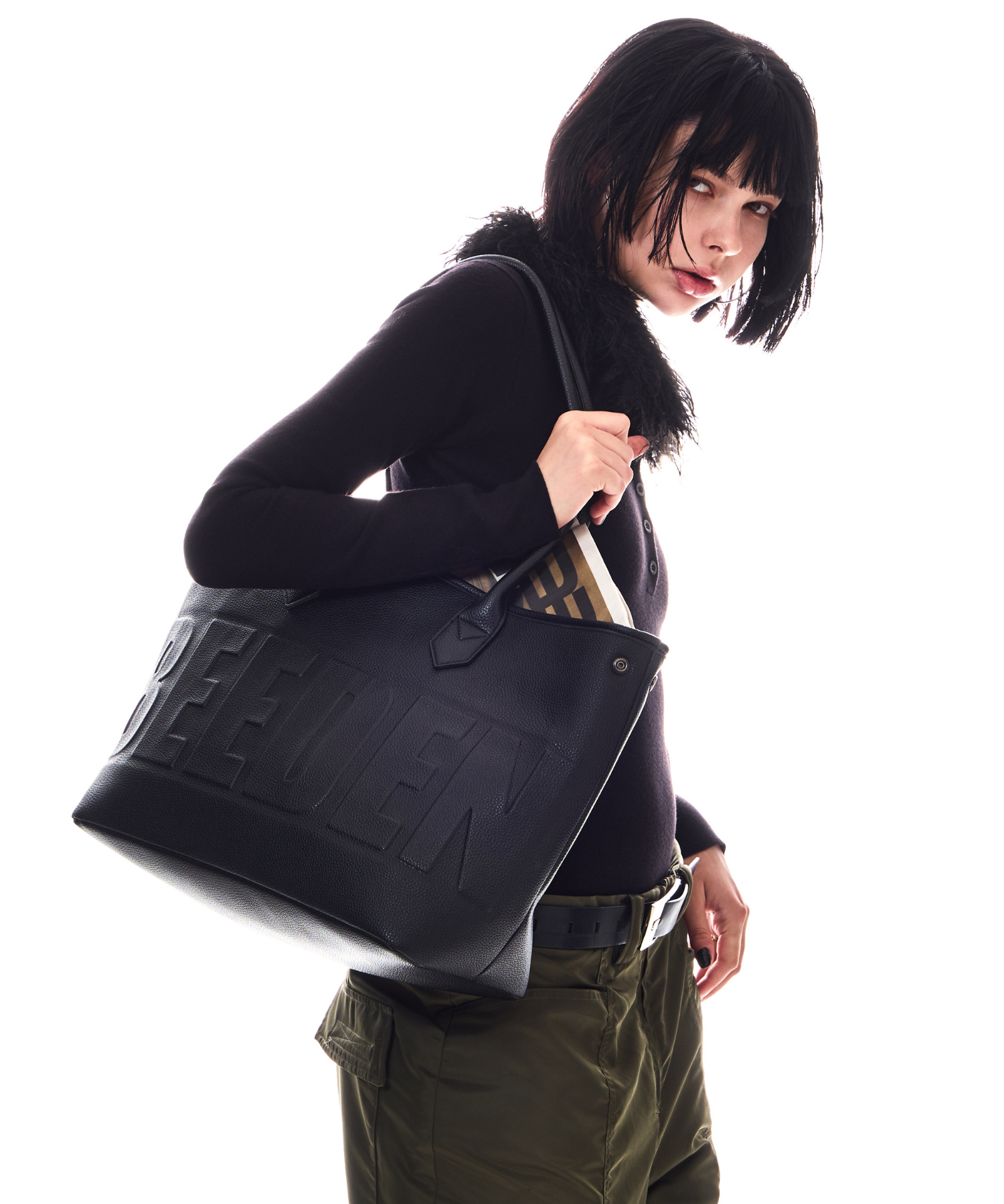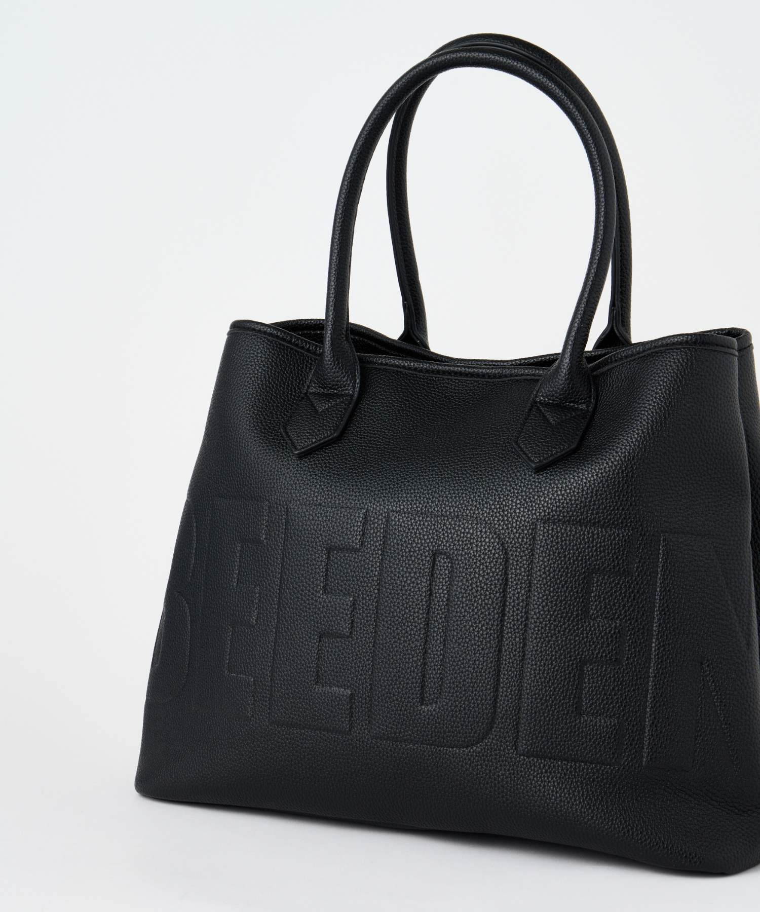 フロントのエンボス加工で施されたロゴが目を惹く大容量のレザーバッグ。