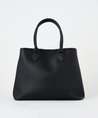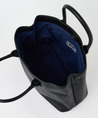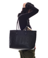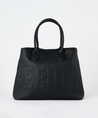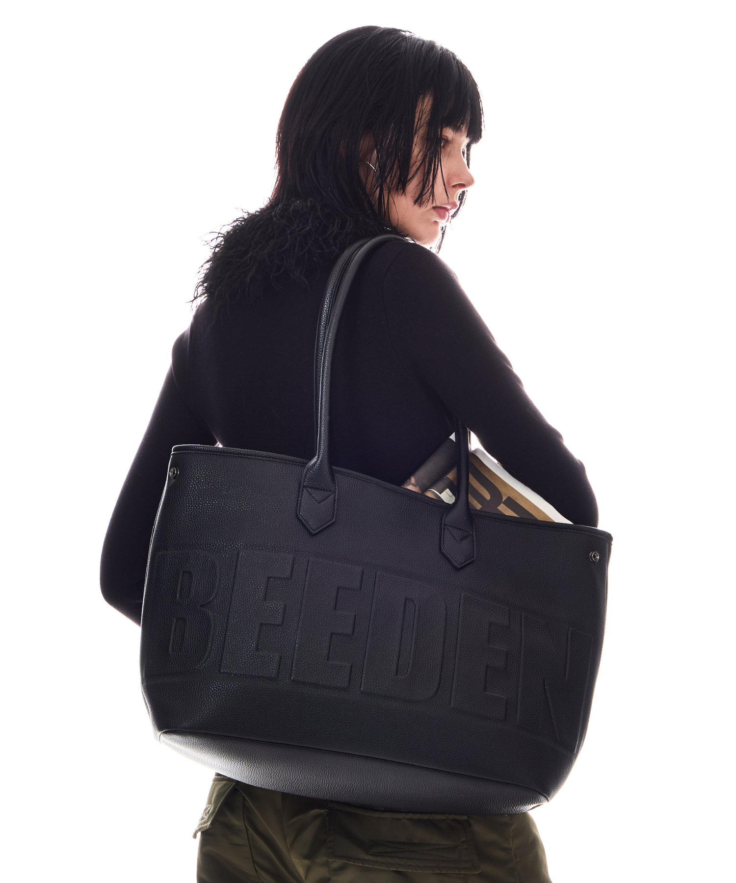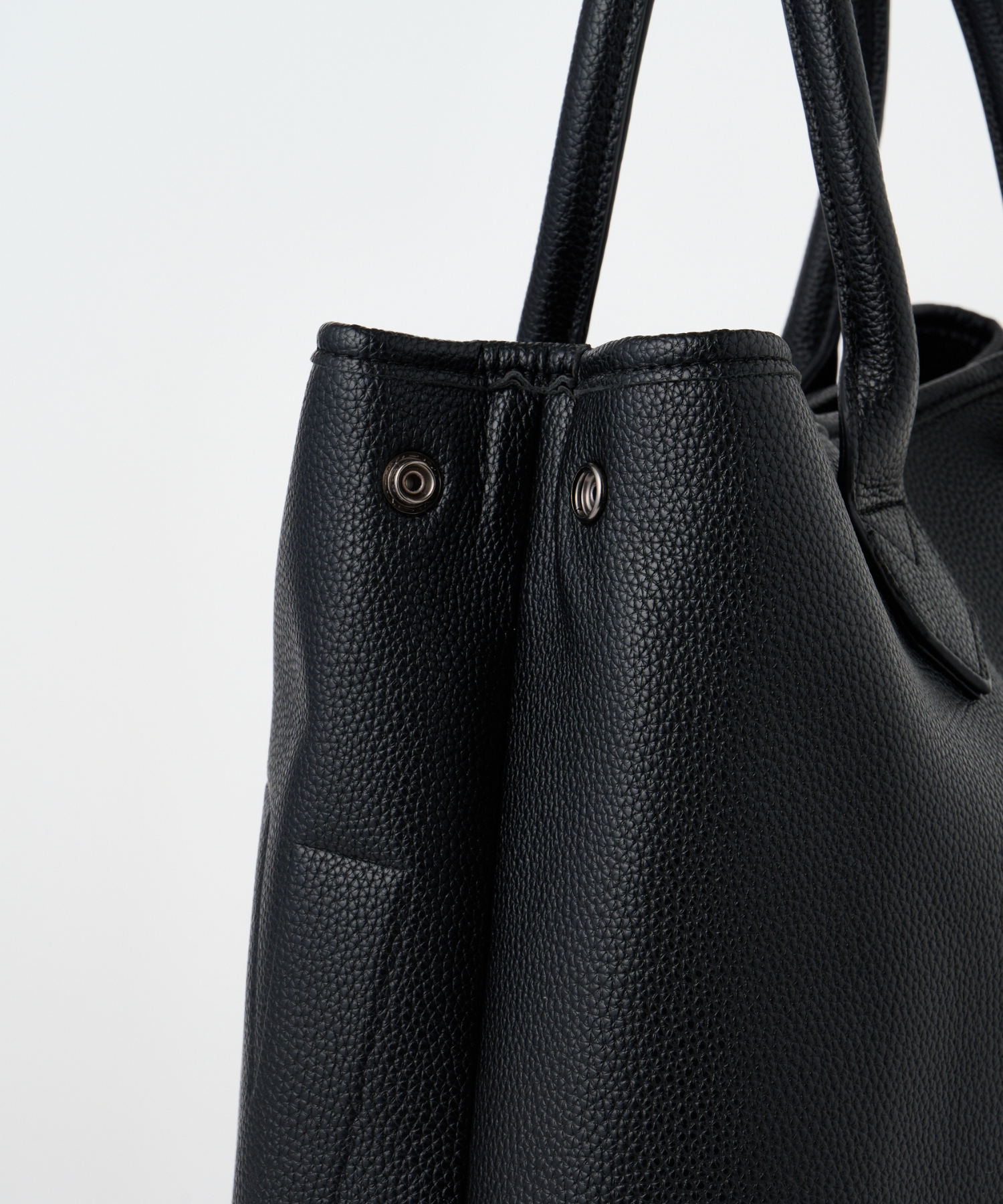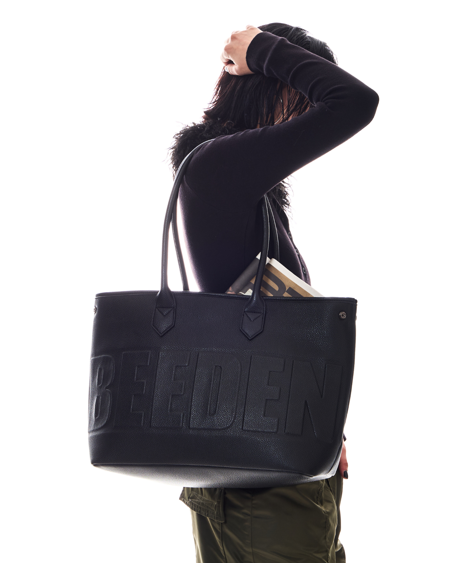 フロントのエンボス加工で施されたロゴが目を惹く大容量のレザーバッグ。
